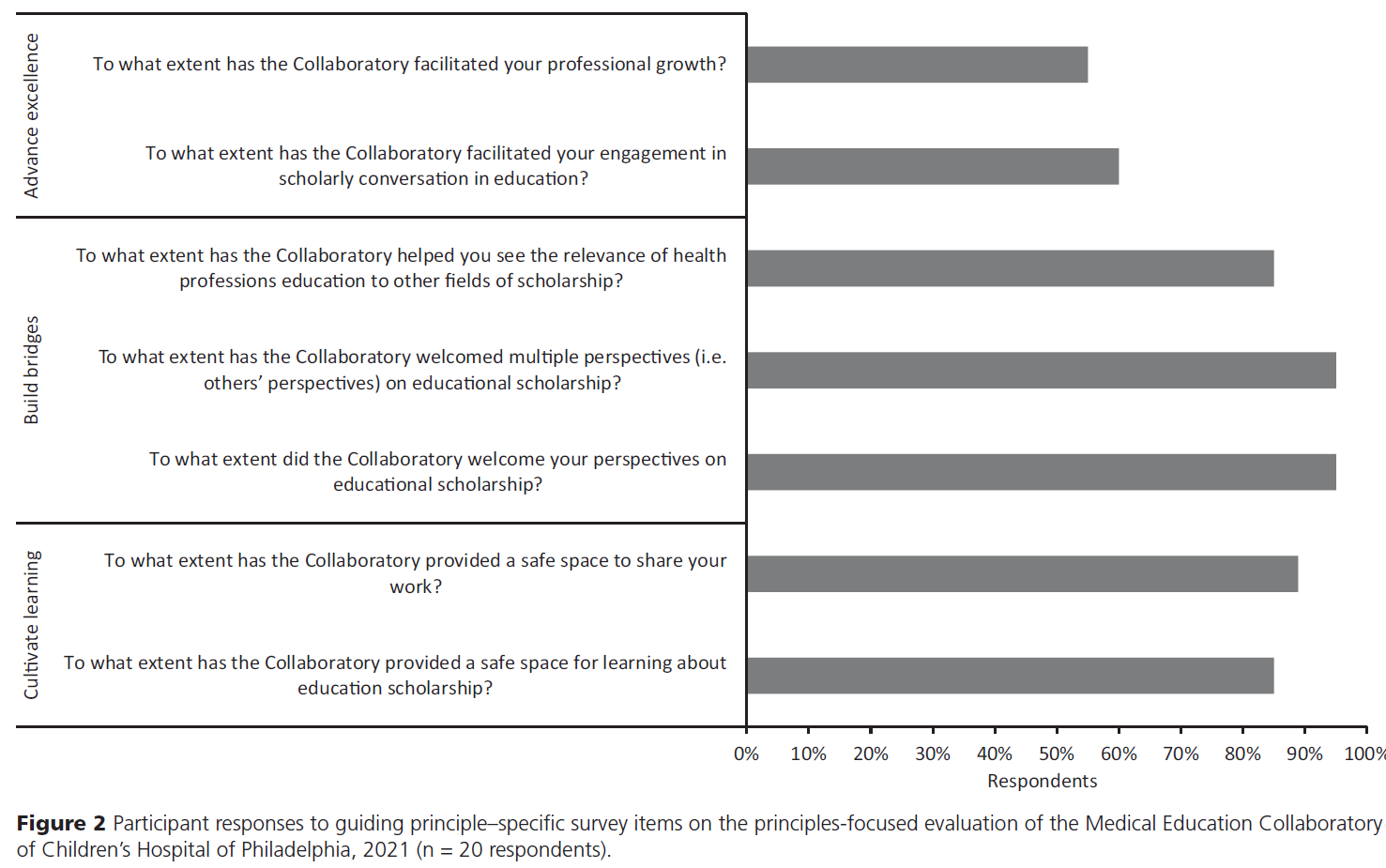 20명의 응답자 중 19명(95%)은 Collaboratory가 개인적인 관점(personal perspectives)과 다양한 학문 분야 간 관점을 HPE에 접목시켜 환영하는 분위기를 조성했다고 응답하였다. 발표자 가운데 약 절반은 Collaboratory에서 발표한 이후 새로운 협업자(collaborator)를 최소 1명 이상 얻게 되었다고 보고하였다.