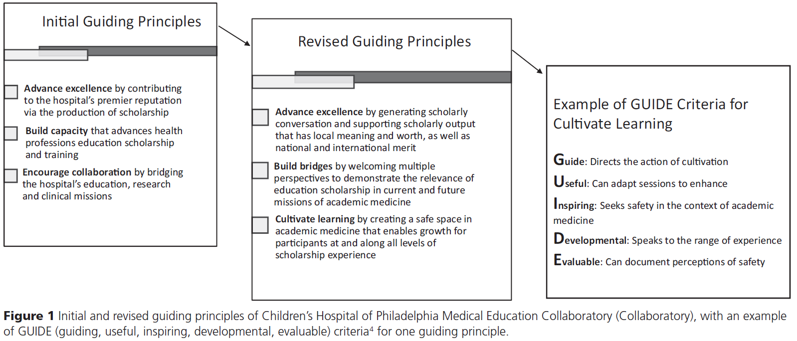 📌 그림 1. 필라델피아 아동병원(CHOP) 의학교육 Collaboratory의 초기 및 수정된 지도 원칙과 ‘학습 조성(Cultivate Learning)’ 원칙에 대한 GUIDE 기준 예시