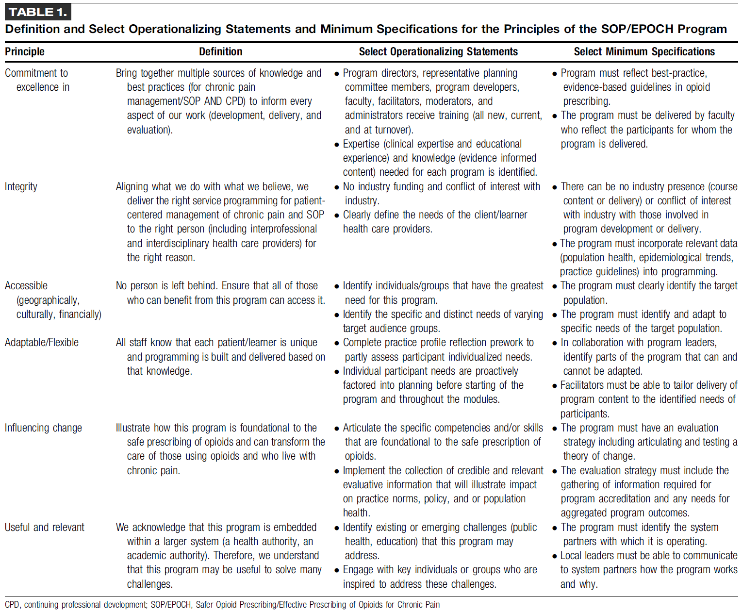 ‘Safer Opioid Prescribing / Effective Prescribing of Opioids for Chronic Pain (SOP/EPOCH)’ 프로그램은 온타리오주 의사 및 외과의사 협회(College of Physicians and Surgeons of Ontario)의 재교육(remediation) 프로그램에서 발전된 것으로, 2012년부터 현업의 보건의료 전문가들을 대상으로 인증된 CPD 프로그램으로 운영되어 왔습니다. 이 프로그램의 목표는 만성 통증 치료 및 오피오이드(opioid) 처방에 관한 보건의료 전문가의 지식과 기술을 향상시키는 것입니다.