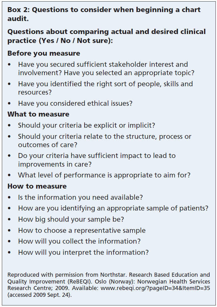 이상적으로는, 검토 기준은 해당 질 지표(quality indicator)에 대해 타당한 근거(valid evidence)에 기반해야 하며, 혈압 또는 혈당이 목표 수준에 도달했는지와 같은 객관적인 지표(objective measures)를 포함해야 합니다. 기초 측정을 수행할 때 사용할 수 있는 접근법은 Box 2에 제시되어 있습니다.