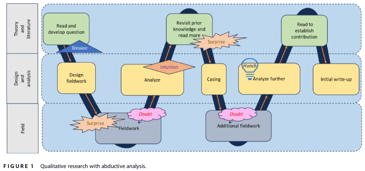 이론적 통찰은 공공행정을 이해하고, 설명하며, 실천하기 위한 핵심 요소이다(Dodge et al., 2005; Emerson, 2022; Hattke & Vogel, 2023). 이론화를 위한 본질적인 방식 중 하나가 바로 ‘abductive analysis(가설적 추론 분석)’이다. 가설적 추론 분석에서는 정성적 연구자가 ‘놀라움(surprises)’과 ‘긴장(tensions)’으로부터 출발하여 이론적 통찰에 이르는 반복적 과정(iterative process)을 거친다. 사실, 질 높은 정성적 연구는 현장조사(fieldwork)와 분석 간의 반복(iteration)을 포함한다는 점은 오래전부터 알려져 있었다(Miles & Huberman, 1994). 그러나 가설적 추론(abduction)의 특징은 연구 초기 단계부터 이론 및 기존 지식과의 적극적인 접촉과 창의적 활용에 있다.