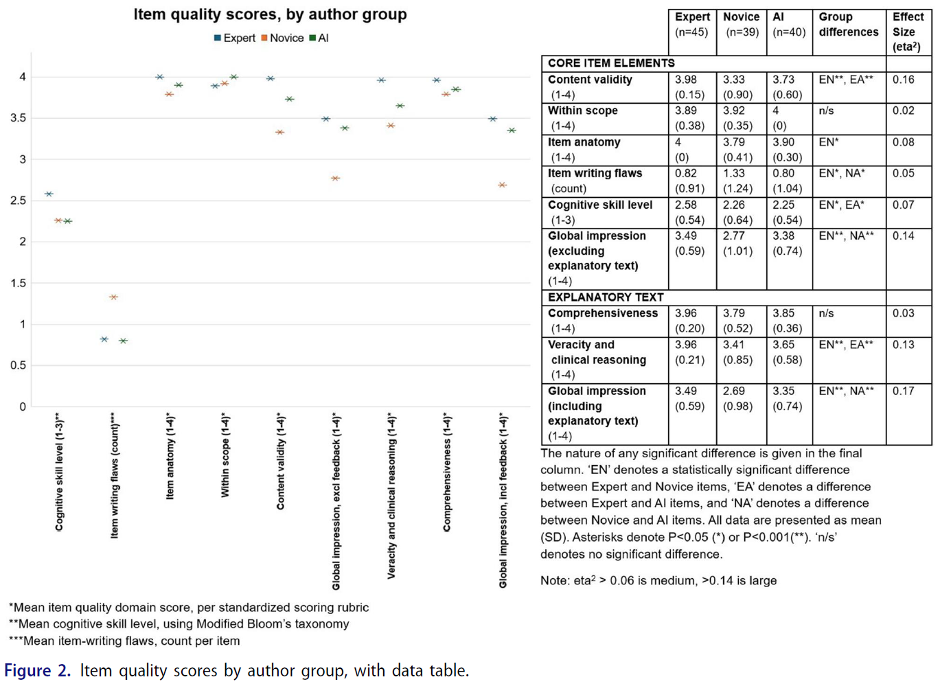 이러한 연구들은 AI가 생성한 문항을, 문항작성 경험이 있는 교수급 전문가들이 만든 문항과 비교하고 있으며, 인간 생성 문항 중에서도 학생이 만든 문항은 인지적으로 도전적인 요소를 가질 수 있다³¹는 점이 알려져 있으나, 전체적인 질은 교수 문항과 차이를 보인다¹³. 그러나 AI가 생성한 문항이 초심자(novice)와 전문가(expert) 문항 작성자 사이에서 어느 위치에 놓이는지는 아직 불분명하다.