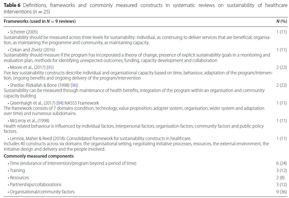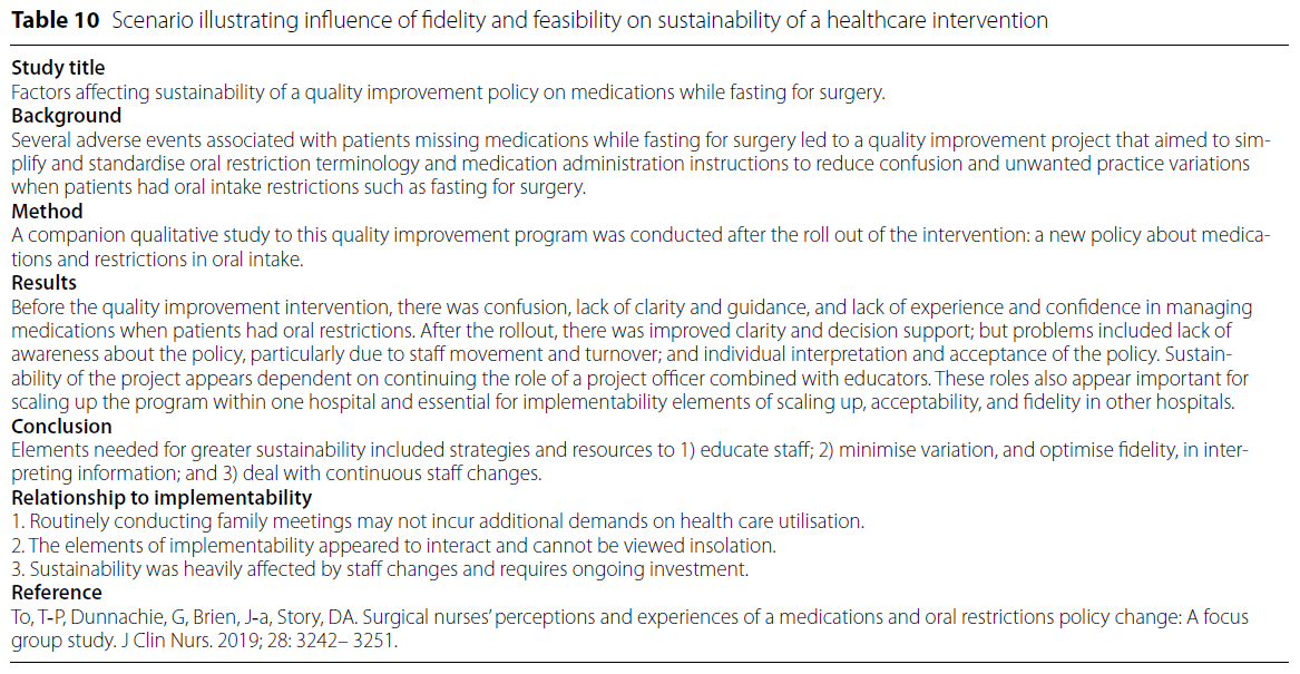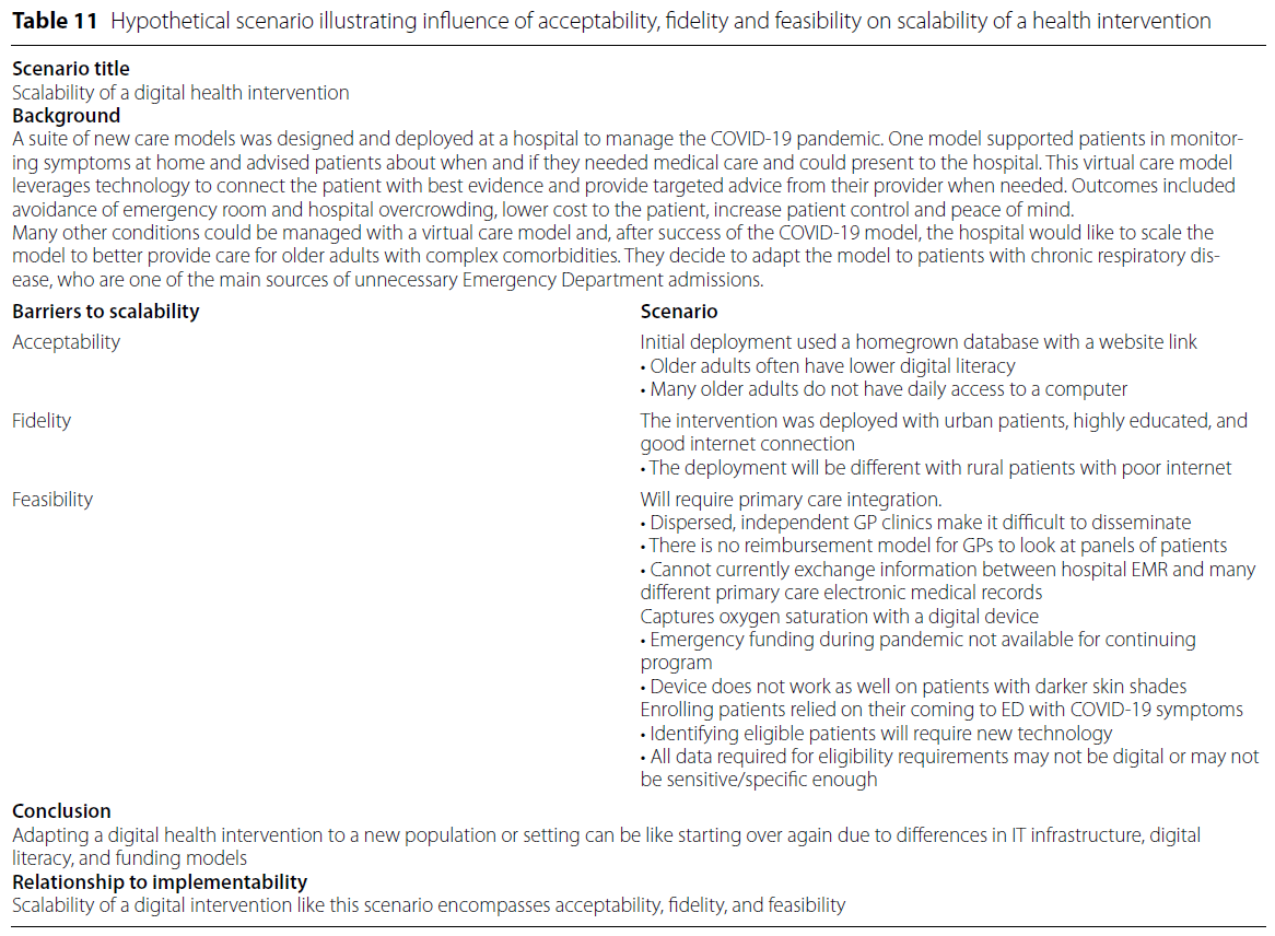 이번 체계적 개관에서 다뤄진 개념들 중, 확장 가능성과 지속 가능성(scalability and sustainability)은 실제로 달성된 경우가 매우 드물었다. 이러한 결과는 다음과 같은 시사점을 제공한다: 보건의료 중재는 개발 또는 파일럿 단계에서는 효과적이고, 수용 가능하며, 실현 가능한 것으로 보일 수 있지만, 이는 곧 성공적인 확장(scale-up)이나 장기적 유지(sustainment)를 보장하지 않는다.