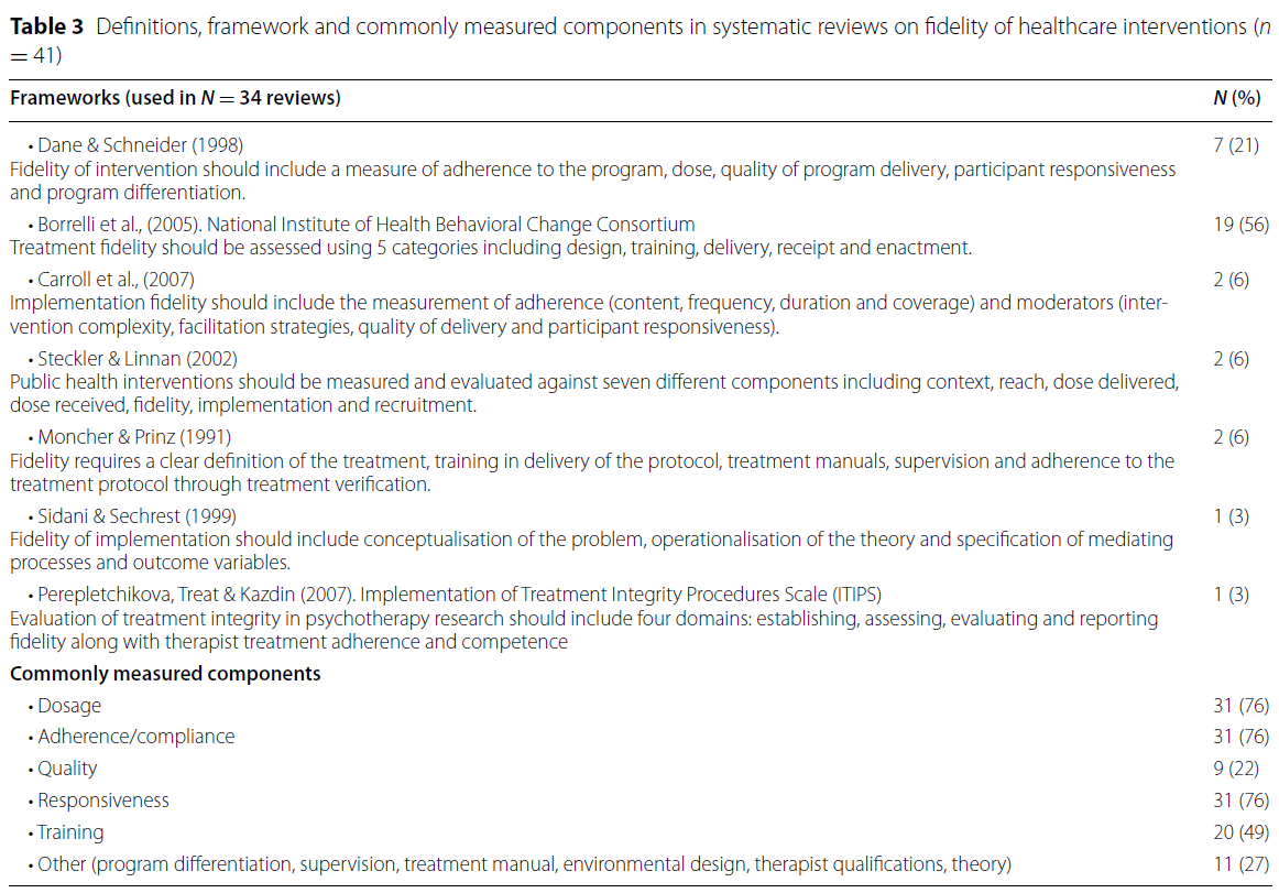 - 중재 제공자(providers)와 잠재적 수혜자(potential recipients) 모두에게 수용성이 충분하다면, 이후 중재가 계획대로 제공되었는지 및 수혜자가 실제로 받은 대로 평가하기 위해 충실도(fidelity)를 확인하는 것이 적절하다.