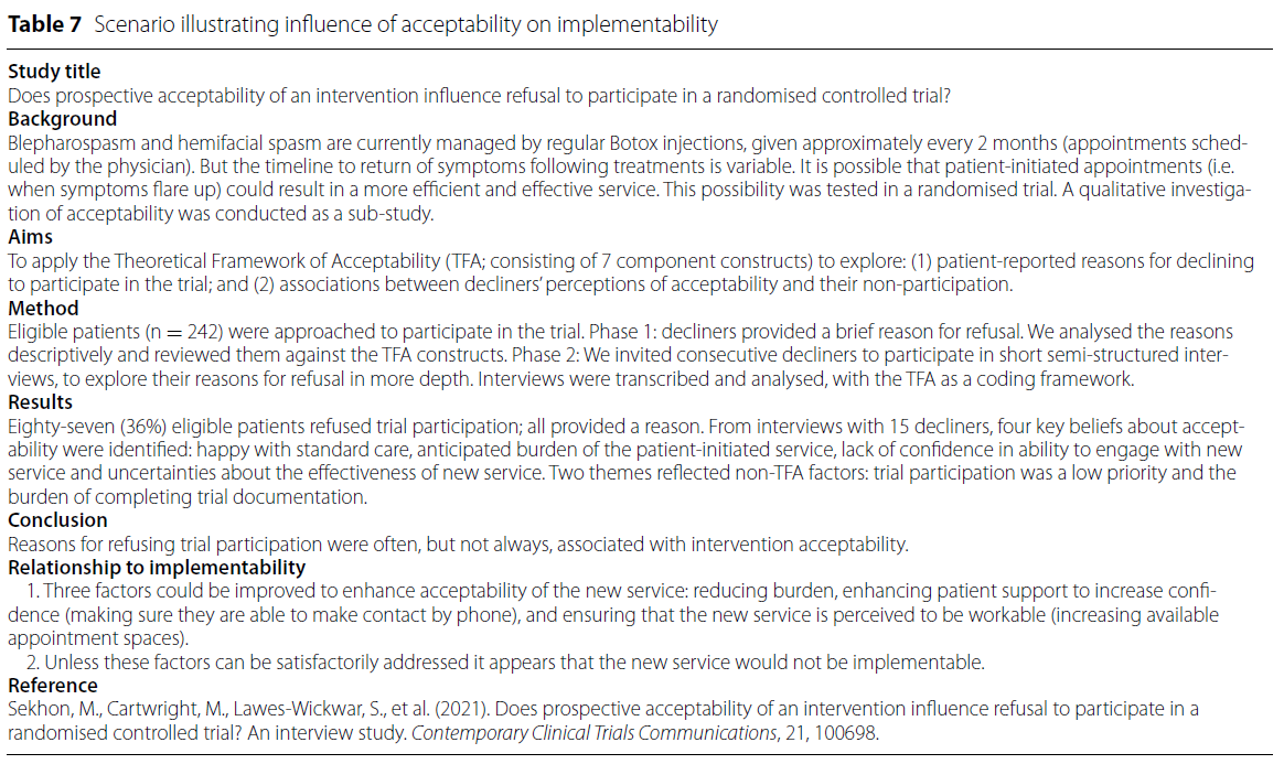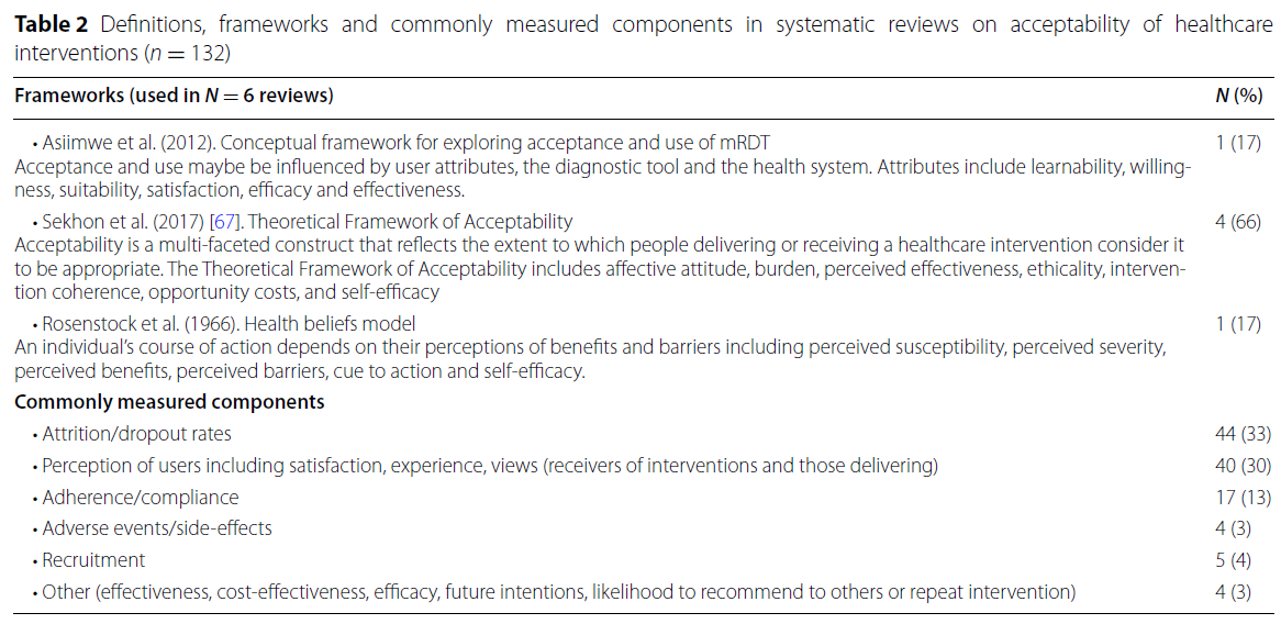 포함된 연구들 중 명시적인 연구 근거(explicit rationale)가 제시된 경우, 저자들은 조사 중인 개념이 실제로 실천 참여도(engagement), 채택(adoption), 지속적 사용(ongoing use)에 영향을 미칠 가능성이 있다고 언급하였다. 예를 들어, 정형외과 환경에서 화상회의(videoconferencing)의 사용에 관한 체계적 문헌고찰(systematic review)에서는 다음과 같이 보고되었다.