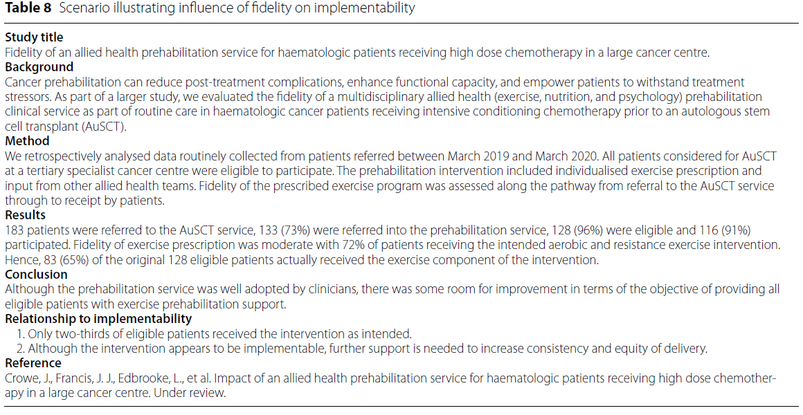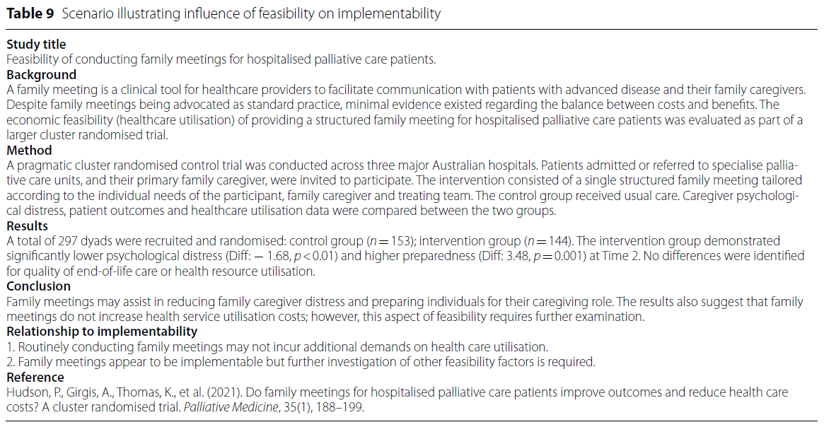 우리는 연구 낭비를 방지하기 위해, 이행 가능성 평가 및 그에 따른 보완 작업이 중재 개발의 임상 평가 단계(clinical evaluation stages)에서 미리 수행되어야 한다고 권장한다 [1, 3]. 이러한 접근은 중재가 실제 임상 실천에 채택되는 속도를 가속화(accelerate uptake into clinical practice)할 수 있을 것이다.