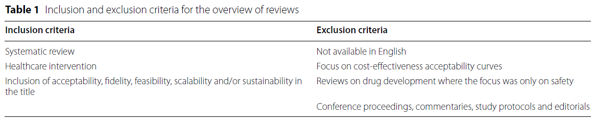 예비 탐색적 검색 결과, 보건의료 중재에 대한 기존 문헌에서 앞서 언급된 다섯 개 개념(acceptability, fidelity, feasibility, scalability, sustainability)에 관한 체계적 문헌고찰(systematic reviews, 이하 SR)이 매우 많이 존재함을 확인하였다.