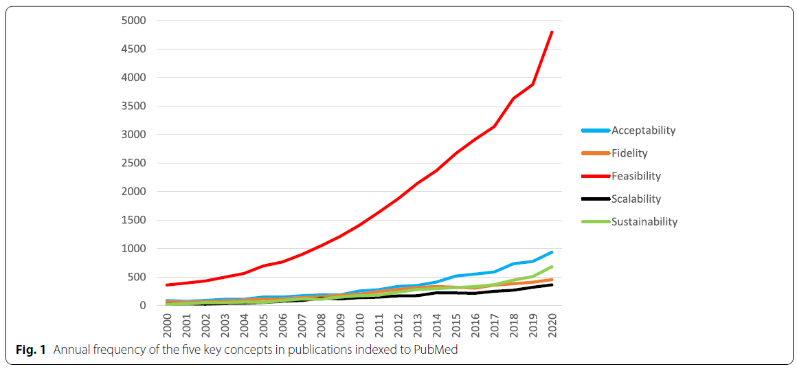 그동안 이행 가능성(implementability)은 학계에서 일부 탐구되어 왔지만, 임상 진료 지침(clinical practice guidelines)의 이행 가능성에 집중된 경우가 많았다 [20,21,22,23]. 보다 최근에는 후기 단계 임상시험(late-phase clinical trials)의 이행 가능성을 중심으로 다뤄지기도 했다 [24]. 반면, 이번 논문은 보다 포괄적인 관점에서, 특히 중재 개발 초기 단계와 평가, 확산(scale-up) 과정, 시간의 흐름에 따른 변화를 고려하면서 보건의료 중재의 미래적(prospective) 이행 가능성에 초점을 맞춘다.