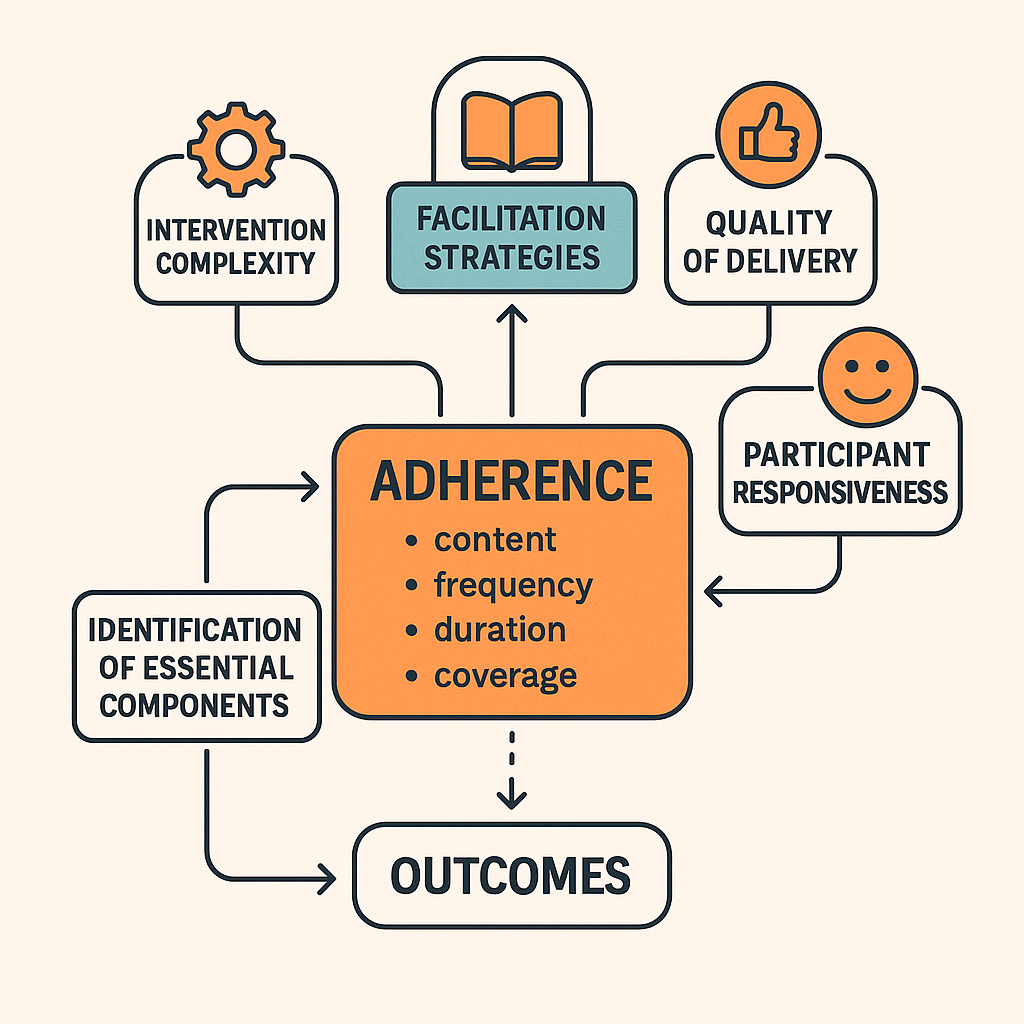 하지만 이 흐름은 단순한 선형 관계가 아닙니다. 중재가 효과를 내기 위해 얼마나 충실히 실행되었는지, 그 충실도(fidelity)를 결정짓는 다양한 요소들이 개입합니다.