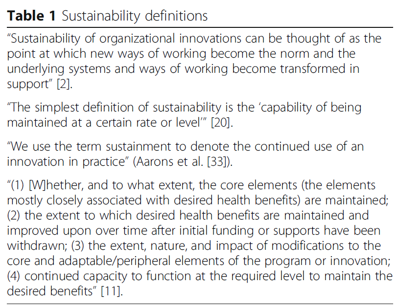 정의의 출처(reference)를 명시하지 않은 이유 중 하나는, 적절한 정의를 선택하는 것이 그 자체로 어려운 과제이기 때문일 수 있다. 이는 ‘지속 가능성’이라는 개념이 임상 중재의 지속적 전달(sustained delivery)을 의미할 수도 있고, 개인의 행동 변화 유지(individual behavior change)를 의미할 수도 있으며, 환자, 제공자, 조직, 지역사회, 시스템 등 다양한 수준(levels)에서 발생할 수 있기 때문이다. 더불어 널리 사용되는 정의들이 서로 다른 구성요소(constructs)를 설명하고 있다는 점도 문제를 더욱 복잡하게 만든다(→ 이에 대한 내용은 Table 1 참고).