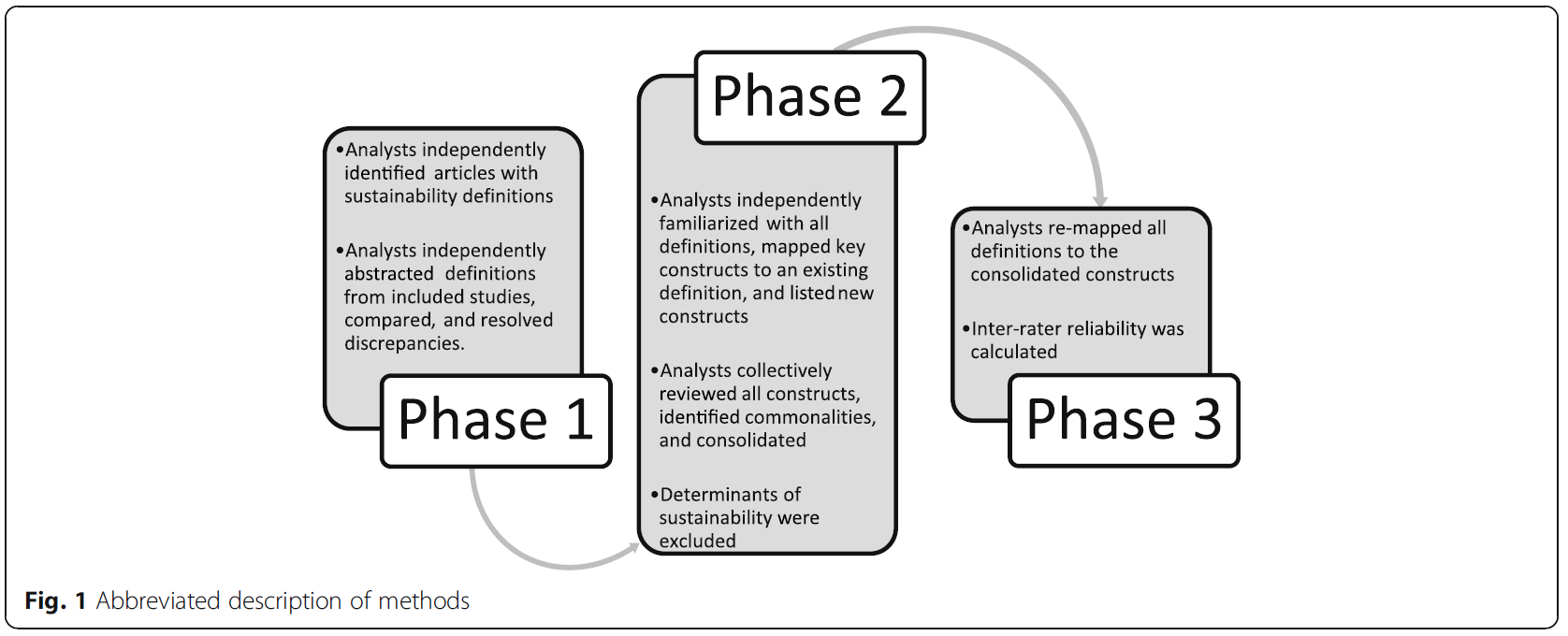 두 명의 분석가(AM, JB)는 각 지식 종합 연구에 포함된 논문 목록 중에서 지속 가능성에 대한 정의를 포함한 논문들을 식별하였다. 이후 이 두 명의 분석가가 각각 독립적으로 각 해당 논문을 검토하여 실제로 정의가 포함되어 있는지를 다시 확인하였다.