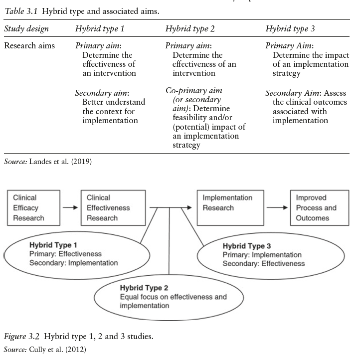 임상 혁신(clinical innovation)의 개발, 평가, 실행을 단계적으로 분리된 접근 방식(discrete steps)으로 수행하는 것은 시간, 연구 비용, 그리고 보건의료 개선 기회의 손실 측면에서 비용이 클 수 있다. 이에 대해 Curran 외(2012)는 기존의 순차적 연구(sequential studies) 접근에 대한 대안으로 ‘효과성-실행 하이브리드 설계(hybrid designs)’를 제안하였다.
