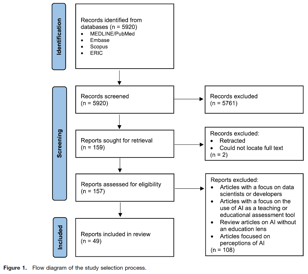 검색 전략을 통해 총 5920개의 기록(records)이 확인되었다(Fig 1). 초록 및 원문 검토를 거쳐 157편의 원문(full-text) 논문이 적합성 평가 대상이 되었으며, 이 중 108편은 다음과 같은 이유로 제외되었다: 데이터 과학자 또는 개발자를 주요 대상으로 한 논문, AI를 교수 또는 교육 평가 도구로 사용한 논문, 교육적 관점이 결여된 AI 관련 리뷰 논문, AI에 대한 인식(perceptions)에 초점을 맞춘 논문. 결과적으로 49편의 논문이 포함 기준을 충족하여 본 스코핑 리뷰에 포함되었다. 이들 논문은 의견/논평(opinion/commentary) 논문(n = 15), AI 교육 프로그램·교육과정·과정·경로(pathway)에 대한 설명 및 평가 논문(n = 16), 리뷰 논문(n = 10), 설문조사 연구(n = 7), 질적 연구(n = 1)로 구성되어 있다.