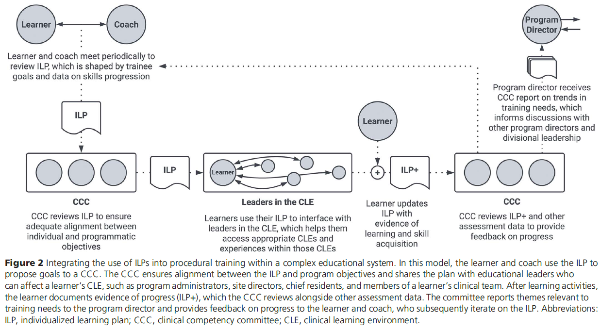 - 학습자는 자신의 ILP를 근거로, 임상 수련 환경(CLE: Clinical Learning Environment)의 교육 리더들(예: chief residents, site directors, program admins)과 연계하여 적절한 시술 경험 기회를 확보합니다.