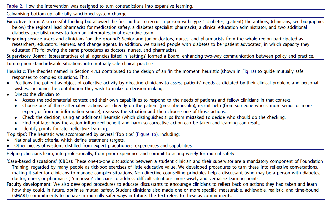 주요한 실천적 함의(practical implication)는 다음과 같다. 상호 안전(mutual safety)을 위한 교육은 경험 기반 학습(experiential learning)에 크게 의존한다. 학습자는 사전에 주입된 추상적인 지식만으로는 준비할 수 없는 복잡한 미래 상황을, 경험에 대한 성찰(reflection on experience)을 통해 능동적으로 대처할 수 있는 자율성(agency)을 키운다. 아이러니하게도, 복잡성에 대한 성찰은 오히려 교육을 단순하게 만들 수 있다. 예컨대, “저혈당 공포증(hypophobia)에 사로잡히지 마라”라는 식의 간결한 교훈은 단순하지만 단순주의(simplistic)는 아닌 교육의 예가 될 수 있다. 또 다른 함의는, 교육자는 개입하려는 과제의 복잡성 혹은 단순성의 정도에 따라 교육 개입의 유형을 조정해야 한다는 것이다. 우리는 독자들에게 Creative Commons 라이선스에 따라 자유롭게 사용할 수 있는 도구에 접근할 것을 권하며, 관련 자료는 『Making Insulin Treatment Safer』(2020)에서 확인할 수 있다. 우리는 곧 이 작업을 ‘툴킷 형태(toolkit form)’로 출간하여, 교육자와 교수 개발자들이 학생 임상의의 역량(capability)과 동기(motivation)를 높여 환자에게 더 큰 이익을 줄 수 있도록 지원할 예정이다.