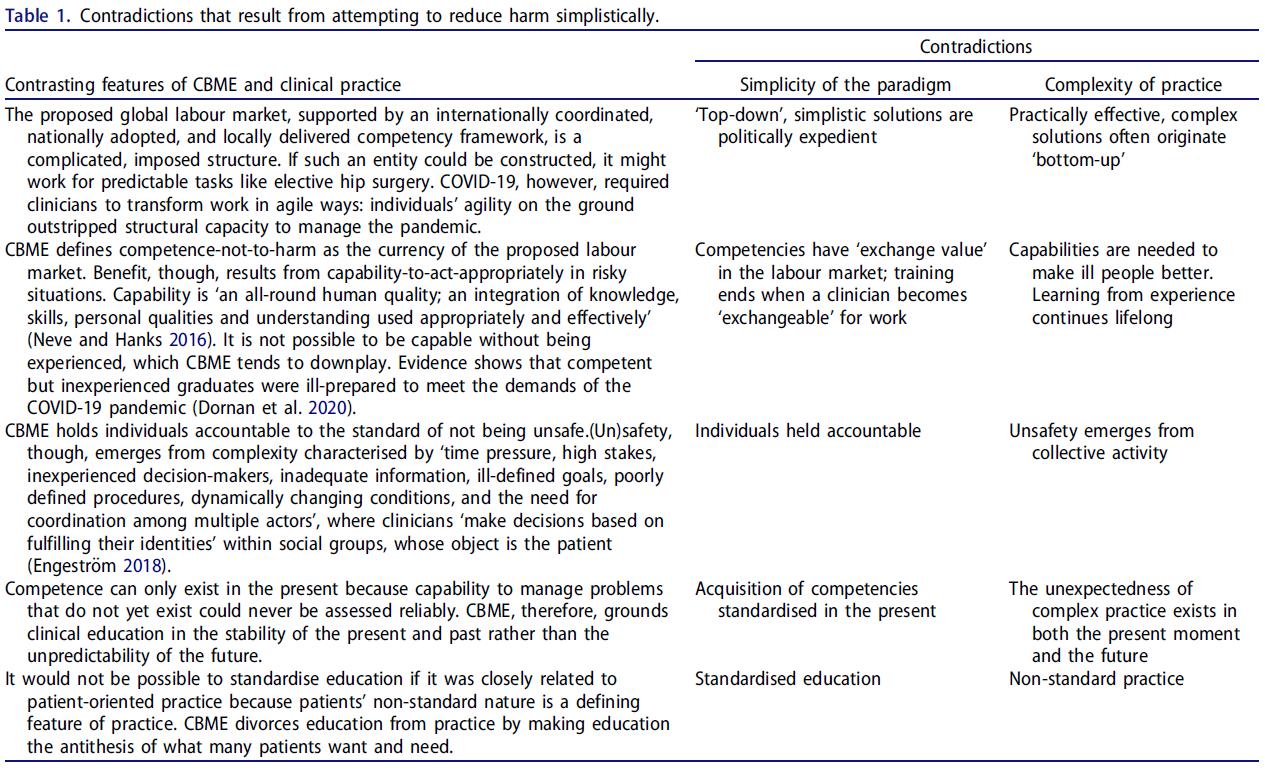 2010년은 플렉스너 보고서(Flexner Report)의 100주년이었다. 카네기 재단은 영향력 있는 학자들에게 다시금 “어떻게 하면 미국 국민에게 이로움을 주는 방식으로 의사를 교육할 수 있는지”를 권고하도록 의뢰했고(Cooke et al., 2010), 『The Lancet』은 전문가들에게 세계 보건을 개선할 방안을 제안하도록 요청했다(Frenk et al., 2010). 이 두 보고서는 모두 임상의의 역량(competencies)을 표준화해야 한다고 권고하였고, 이는 CBME가 교육 패러다임(paradigm)으로 자리잡는 데 힘을 실어주었다. 그러나 이러한 권고는 새로운 모순(contradictions)도 함께 불러왔으며, 표 1(Table 1)은 그 세부 사항을 정리하고 있다. 예컨대, 의사는 환자를 전체론적으로 접근해야 한다는 권고는 임상 문제의 복잡성을 암묵적으로 인정한 것이었지만, 그와 동시에 ‘역량’은 단순한 것이다라고 규정하였다. (국가 및 국제 수준에서) 합의된 표준화된 역량이 글로벌하고 전문직 간 통합된 노동 시장(global, interprofessional labour market)에서 교환 가능한 통화(currency)로 기능할 수 있으리라는 제안도 있었다. 표 1은 이러한 거대한 레고 조립식의 역량 구조(Lego model of interchangeable competencies)가, 실제의 전 지구적 보건 위협(global health threat)—예컨대 COVID-19—과 같은 상황에 민첩하게 대응할 수 없었을 것임을 보여준다. 이후 발표된 연구들(Irby & Hamstra, 2016)은 이러한 모순이 단순성을 요구하는 평가(assessment)가, 복잡성을 다루는 의사들의 실제 전문 실천(practice)을 오히려 지배하게 된 결과라고 지적했다.