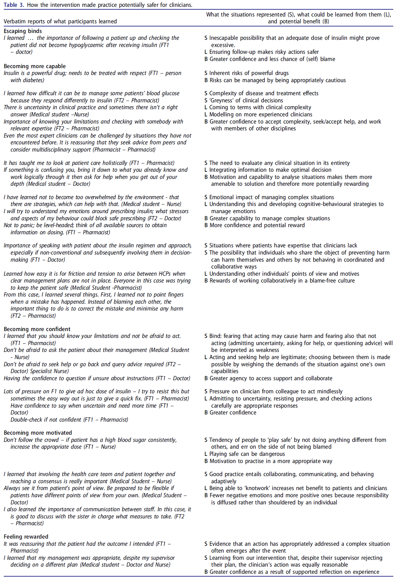잠재적 이로움은 임상의들이 복잡한 상황을 더 잘 다루도록 자율성을 부여하고, 그 결과 역량이 향상됨으로써 발생하였다. 그림 2는 환자에게의 이로움 최적화가 어떻게 정서적 이득(affective benefits)으로 이어졌는지를 보여준다. 표 3은 직접 인용(verbatim quotations)을 통해 임상의가 경험한 이로움을 더 세밀하게 분석하고 있다.