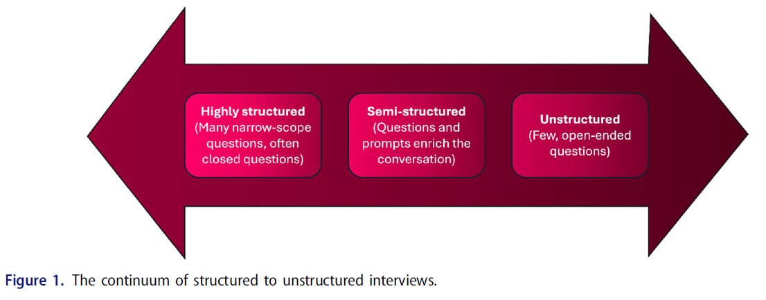 질적 연구 인터뷰(qualitative research interviews)는 구조화 수준이 다양하며, 느슨하게 계획된 비구조화 대화(unstructured conversations)부터 사전에 면밀히 준비된 고도로 조직화된 토론(highly organized discussions)까지 범위를 가진다 (Figure 1 참조). 이 두 극단 사이의 반구조화 인터뷰(semi-structured interview)에서도 질문의 수, 유형, 유도문(prompt)의 방식은 다양하게 나타난다. 인터뷰 질문은 참여자에게 사고방식(ways of thinking), 현상에 대한 이해(understanding a phenomenon), 그리고 특정 사건과 관련된 감정·감각·성찰에 대한 기억(memories of emotions, sensations, reflections)을 이야기하도록 요청할 수 있으며, 종종 이야기(stories)와 사례(examples)를 통해 표현된다.