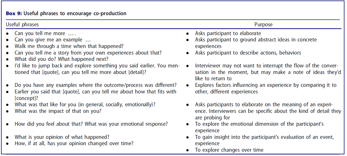 참여자(participant)와 인터뷰어(interviewer)의 편안함(comfort)과 라포(rapport)는 데이터 공동 생산(data co-production)에 매우 중요하다.