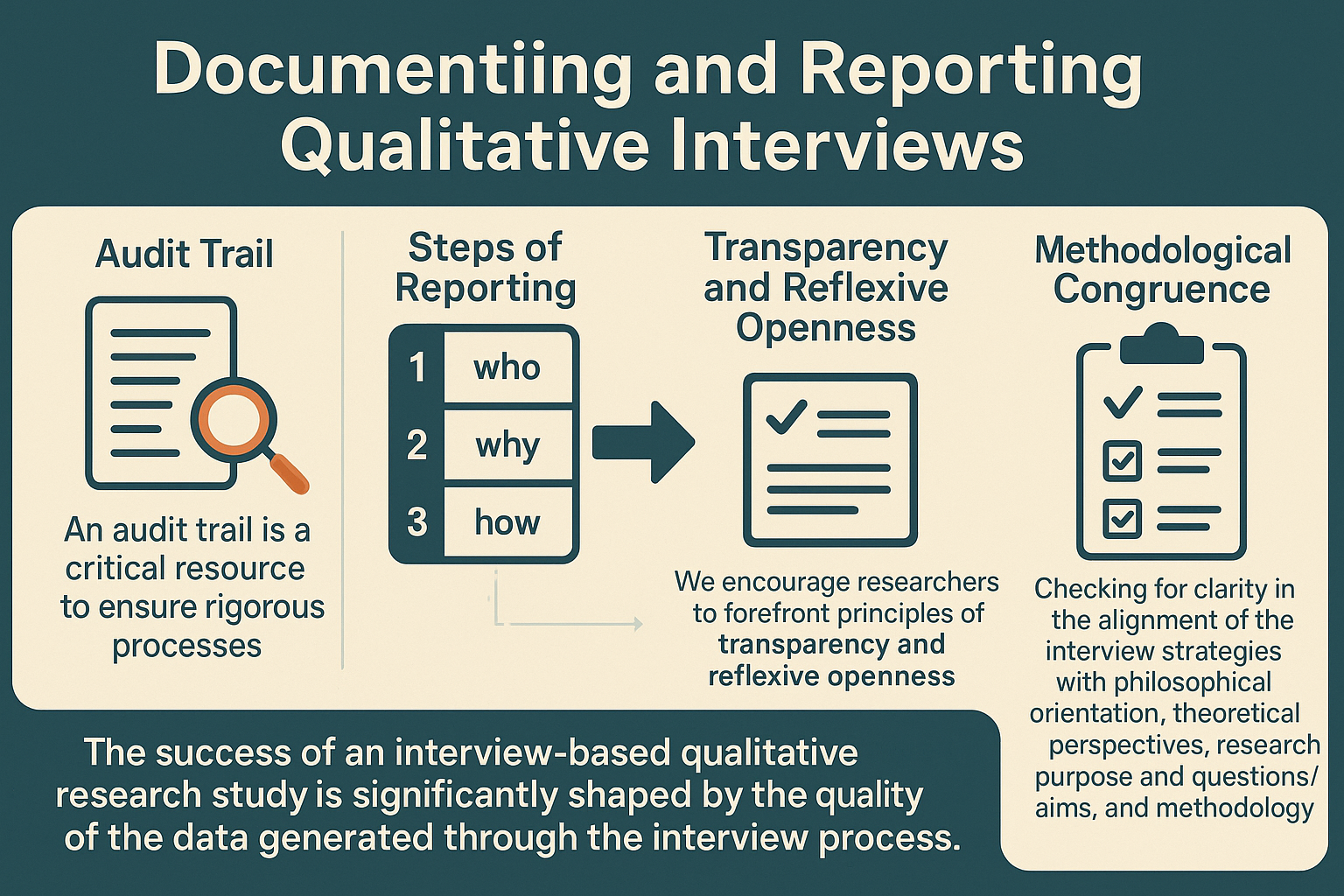 - 인터뷰어의 성찰 일지(reflective journal entries), 현장 기록(field notes), 메모(memos)를 포함해 인터뷰 및 동시 분석 과정(concurrent analysis process)을 기록할 것