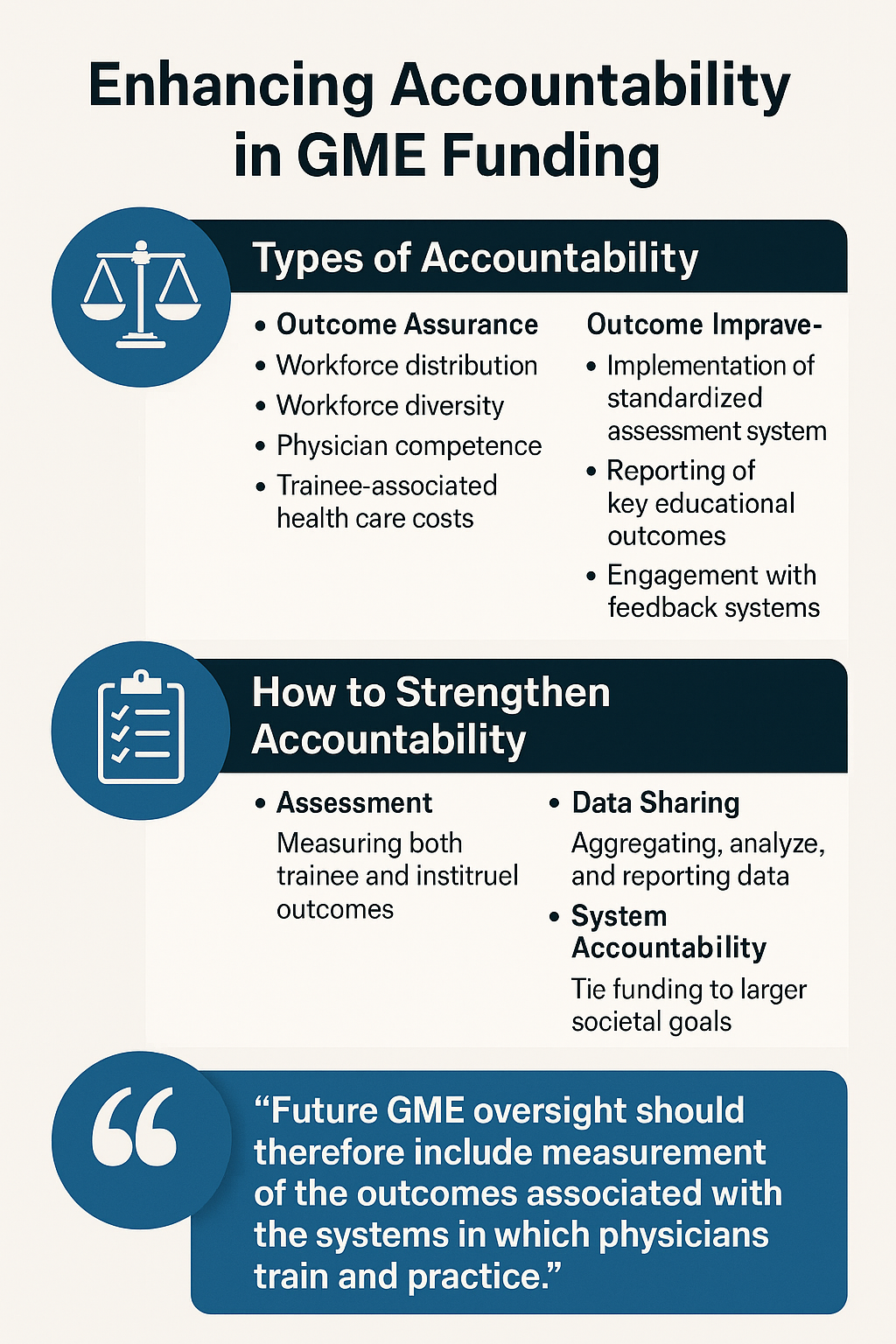 우리는 향후 공적 GME 자금(public GME funding) 사용에 있어 고려해야 할 두 가지 주요 범주(primary categories)의 책임성(accountability)이 있다고 본다. 그것은 성과 보증(outcome assurance)과 성과 개선(improvement)이다.