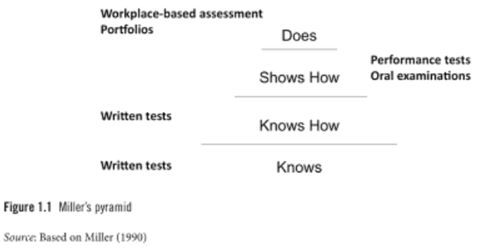 그림 1.1(Figure 1.1)에서 밀러의 피라미드는 인지적 지식(cognitive knowledge)이 기반부에 놓여 있으며, 이는 보건의료 분야에서의 학습의 다른 모든 중요한 측면/특성의 토대임을 보여준다. 이것이 곧 “knows” 수준으로, 대부분의 복잡한 학습이 의존하는 생물학적 과정과 과학적 원리에 관한 필수 사실 지식(essential factual knowledge of biological processes and scientific principles)을 의미한다. 지식(knowledge)은 학습자에게 기대되는 다른 거의 모든 유형의 학습의 필수 전제조건이다. 밀러는 이 “knows” 수준이 선다 및 서답형 검사(selected- and constructed-response tests)와 같은 객관식 필기시험(written objective tests)으로 가장 잘 측정된다는 데 동의할 것이다.