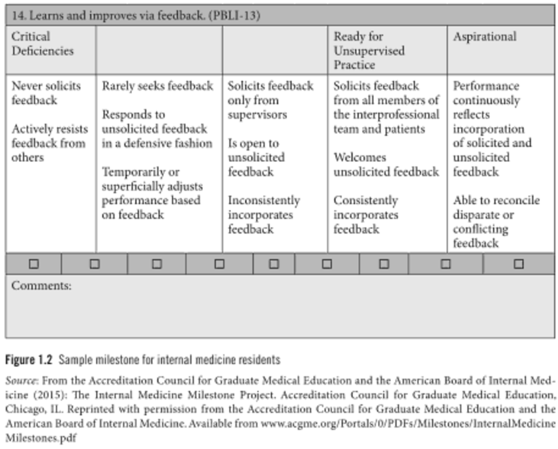 - 예를 들어, 내과 전공의의 마일스톤 하위 역량(sub-competencies)은 표 1.1(Table 1.1)에 제시되며, 마일스톤 척도(scale)의 예시는 그림 1.2(Figure 1.2)에 제시된다(ACGME & American Board of Internal Medicine, 2015).