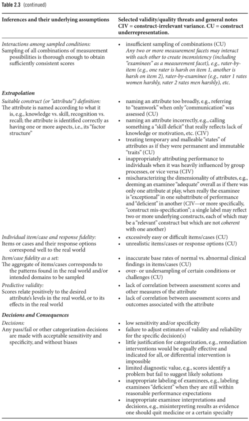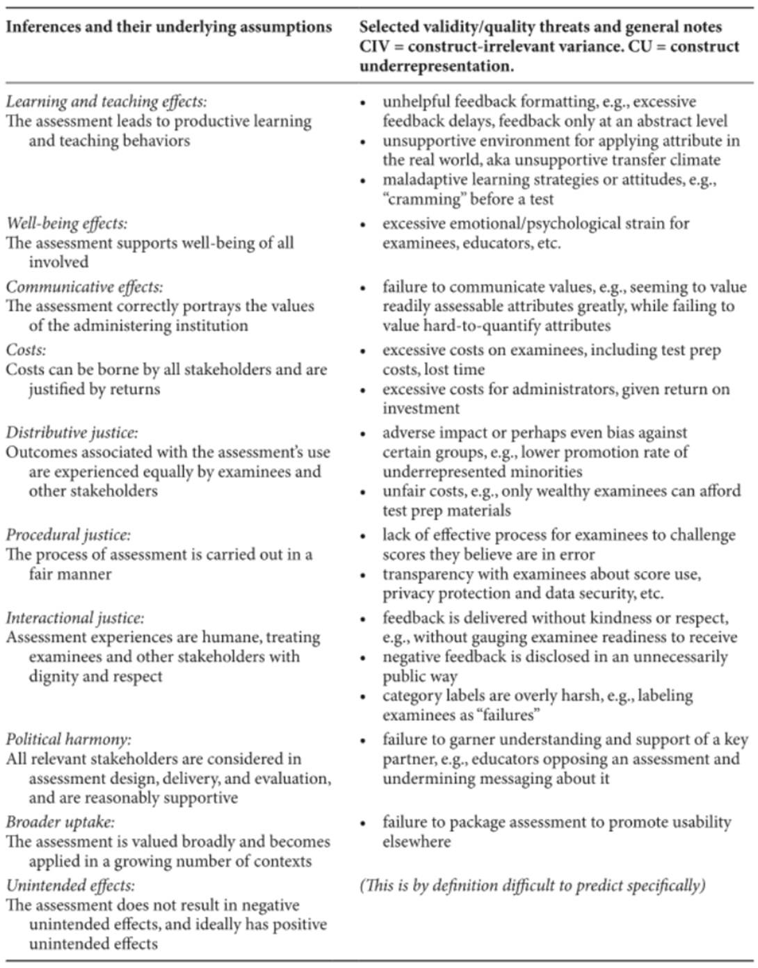 결국, 어떤 시험은 위의 의미에서 “타당(valid)”할 수 있으나, 용납할 수 없는 부정적 결과를 초래한다면 질이나 적합성은 낮다고 볼 수 있다. “평가(evaluation)”라는 표현은 또한 이 질문을 넓은 시각에서 바라봐야 함을 상기시킨다. 즉, 교육 및 보건의료 시스템이라는 복잡하고 혼란스러운(big, messy) 맥락 속에서, 평가가 긍정적·부정적 영향을 어떻게 미치는지를 검토해야 한다는 것이다.