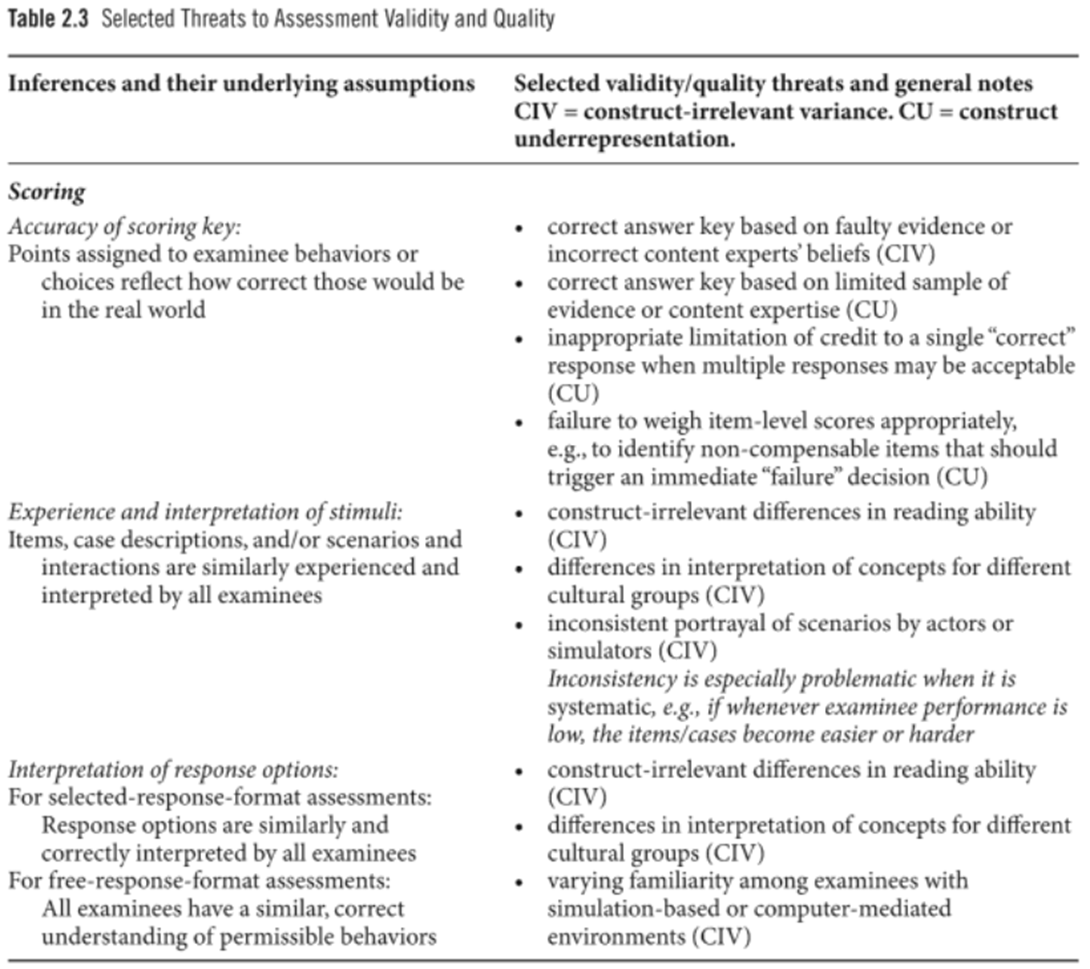 예컨대 SP가 응시자 행동의 포착·기억·채점·피드백 제공에서 변덕스러우면(capricious), 보충 결정에서 거짓 양성/거짓 음성(false positives/false negatives)이 많이 발생하고, 응시자는 경험으로부터 크게 배우지 못할 수 있다. 심지어 교육 환경에 대한 신뢰(trust)를 잃을 수도 있다. 그러므로 이러한 가정들을 명시하고, 그것이 성립하는지에 유의(attentive)하는 것이 중요하다—즉, 일정 수준의 “타당도 탐구(validity investigation)”와 “질 평가(quality evaluation)”를 수행해야 한다.