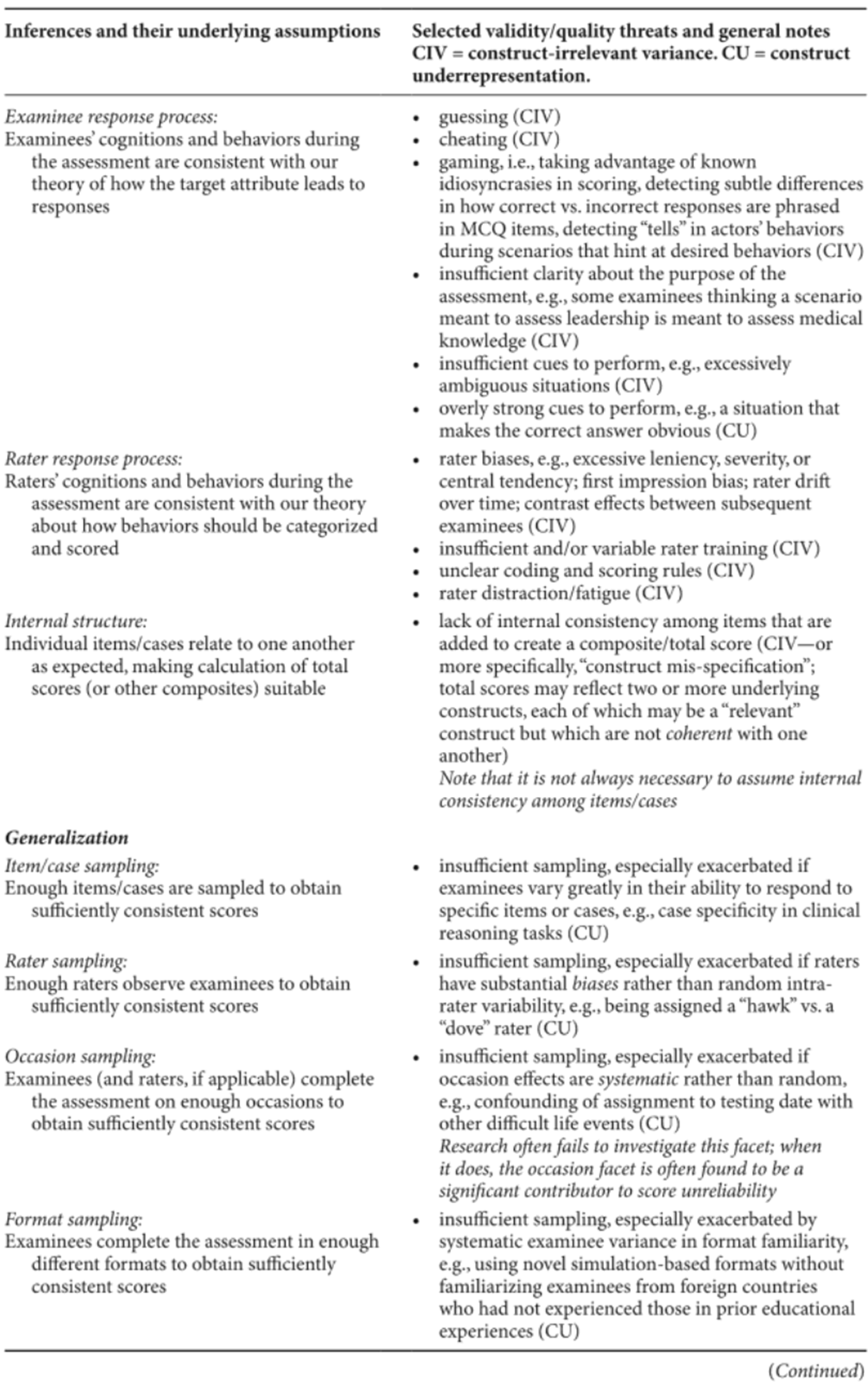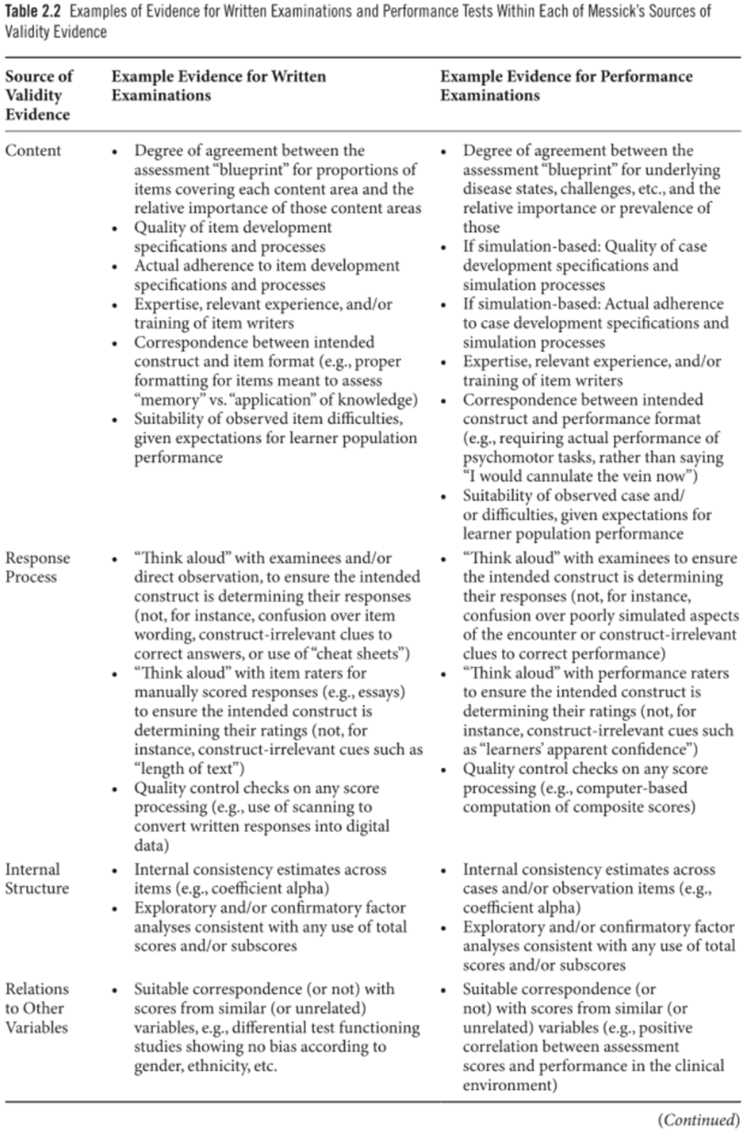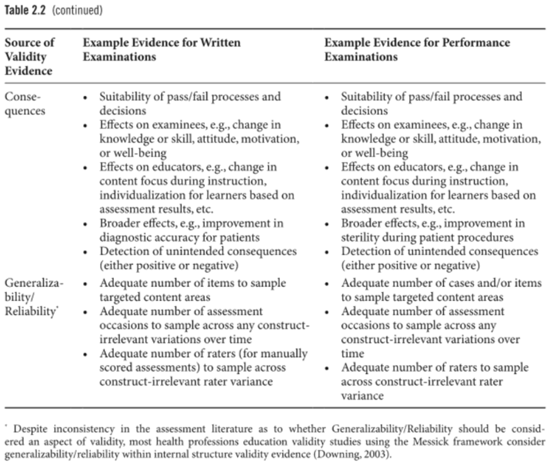 - 외삽(Extrapolation): 관찰된 점수가 우리가 실제로 중요하게 여기는 수행(performance)을 적절히 예측한다(예: 평가에서의 모의환자(simulated patients)가 아닌 실제 환자(real patients)와의 임상 추론 능력).