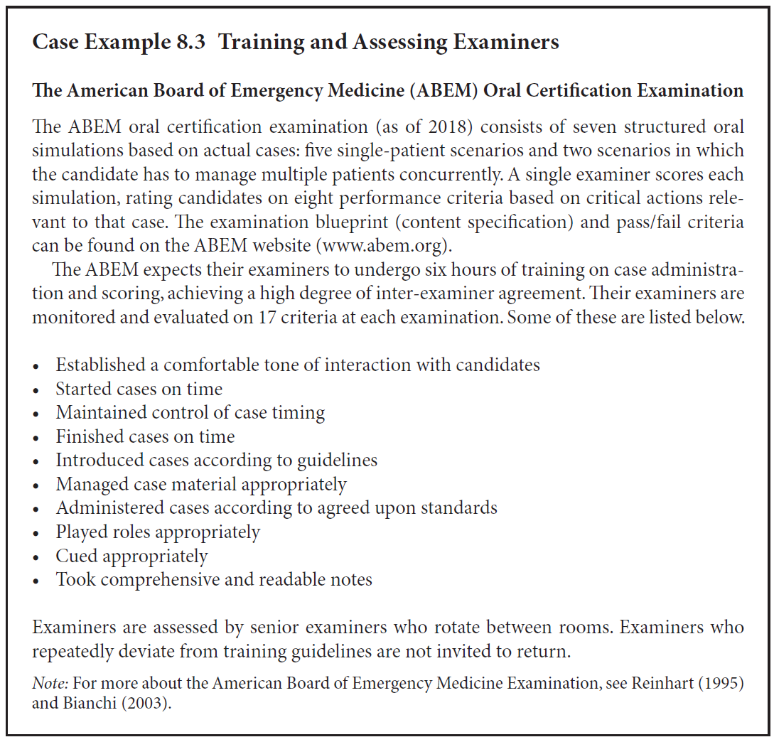 Case Example 8.3에서는 미국 응급의학 전문의 위원회(ABEM) 구술 자격시험(Oral Certification Examination)을 위한 평가자 훈련(examiner training)을 설명하며, Table 8.3에는 평가자 훈련 단계(examiner training steps)가 요약되어 있다.