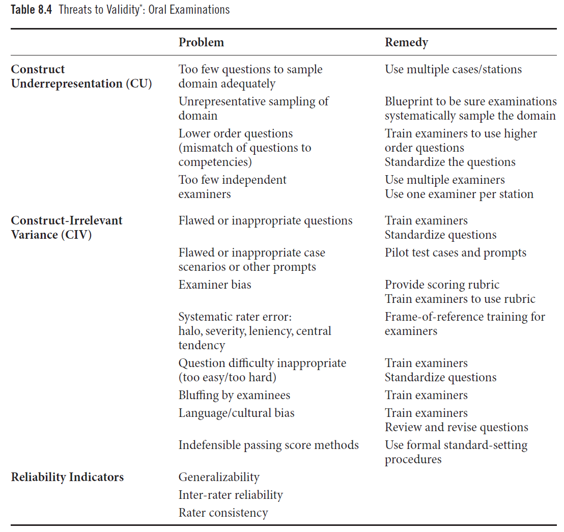 - 두세 개의 주제나 임상 시나리오(clinical scenarios)만으로 구성된 구술시험은 내용 영역(content domain)을 폭넓고 체계적으로 표집하기 어렵다 (Turnball, Danoff, & Norman, 1996; Norcini, 2002)