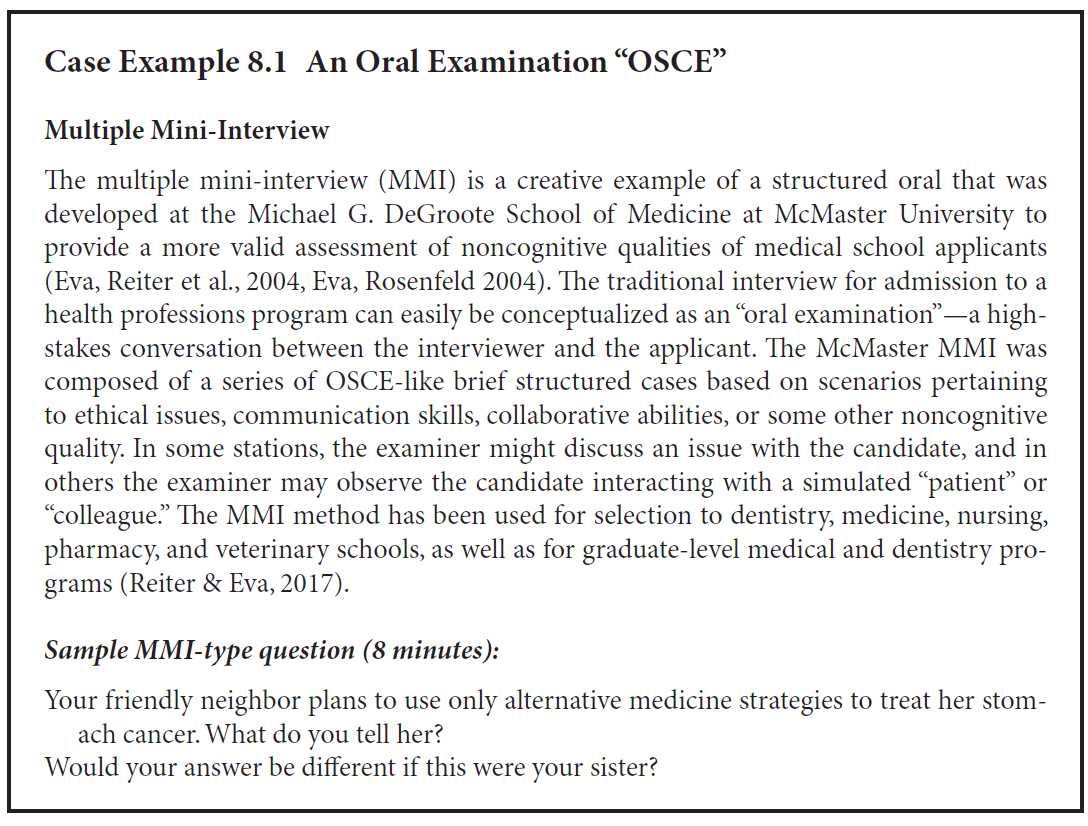 다중 미니 인터뷰(Multiple Mini-Interview, MMI)는 Case Example 8.1에서 설명된 바와 같이, 의대 입시에서 사용되는 짧은 구조화 인터뷰 시리즈(short structured interviews)로서, 비구조화된 장시간 인터뷰(long unstructured interviews)를 대체하는 OSCE 유사 형식(OSCE-like format)이다.