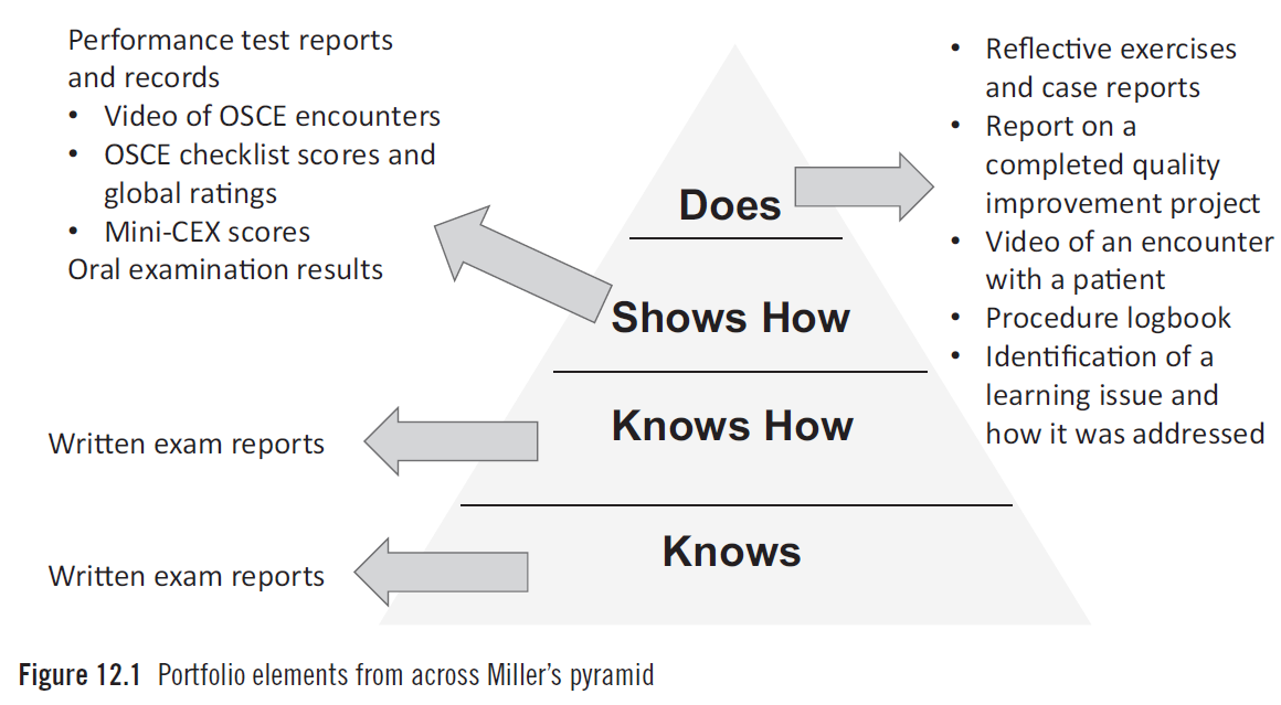 이러한 포트폴리오는 Miller의 피라미드(Miller’s pyramid)의 전 범위—‘앎(knows)’에서 ‘실행(does)’까지—를 포괄하는 항목(entries)을 포함할 수 있다 (Chapter 1 및 Figure 12.1 참조).