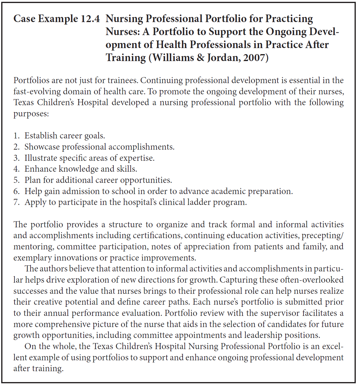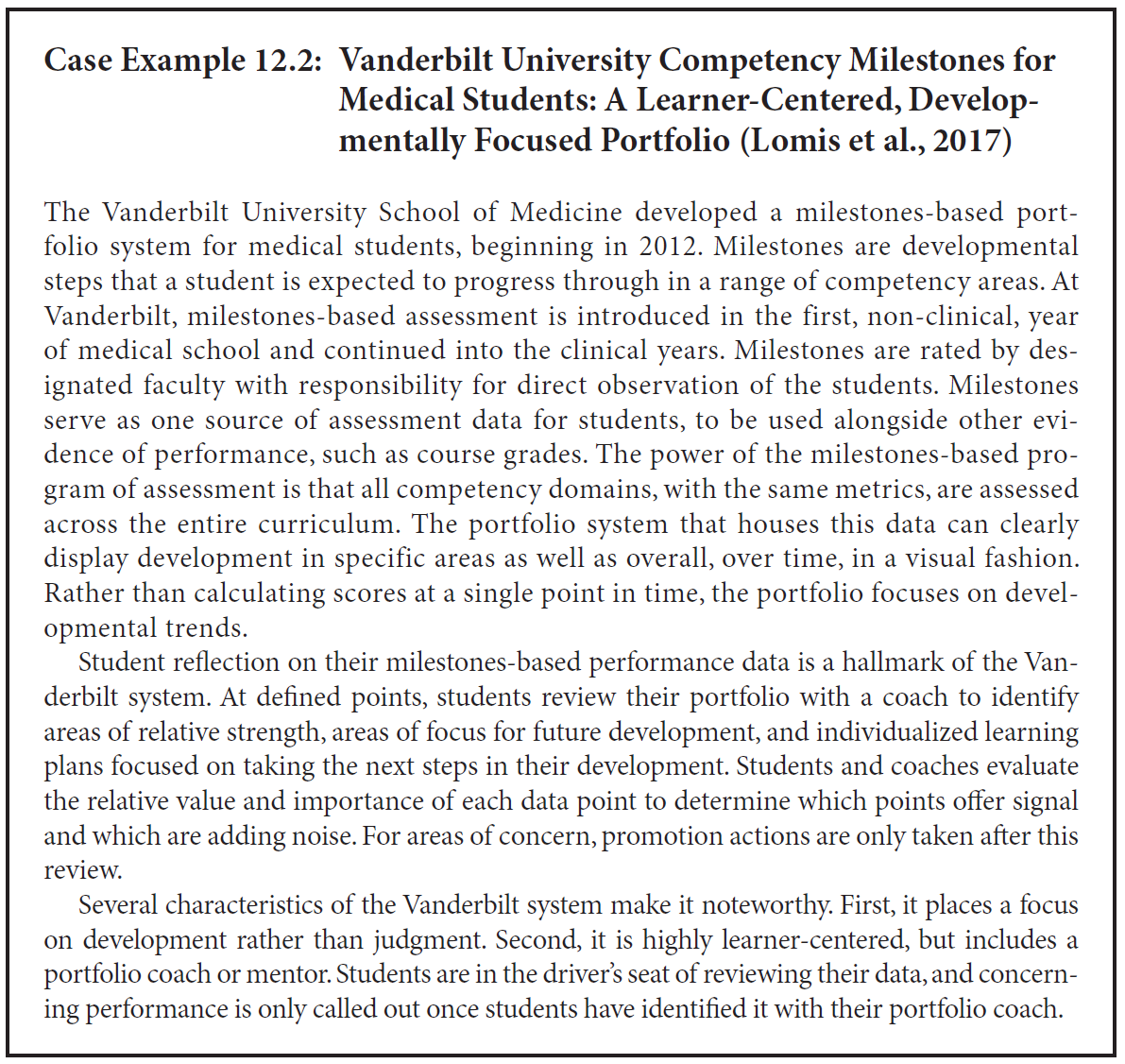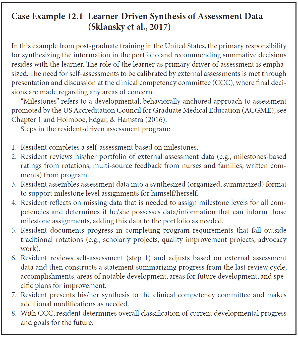 분명히, 이러한 평가는 학습자(learner)가 아닌 평가자(assessor)에게 최종적으로 귀속되어야 한다. 그러나 포트폴리오가 지닌 중요한 형성적 목적(significant formative purpose)과, 평생학습 역량(lifelong learning skills)을 촉진·발달시킬 수 있는 잠재력을 고려할 때, 저자들은 총괄적 목적(summative purposes)조차도 학습자 주도적(learner-driven)이어야 한다고 주장한다 (O’Brien, Sanguino, Thomas, & Green, 2016; Schmitz, Whitson, Van Heest, & Maddaus, 2010; Sklansky, Frohna, & Schumacher, 2017). 사례 예시 12.1(Case Example 12.1)은 그러한 학습자 주도형 포트폴리오(learner-driven portfolio)의 구체적인 예를 보여준다.