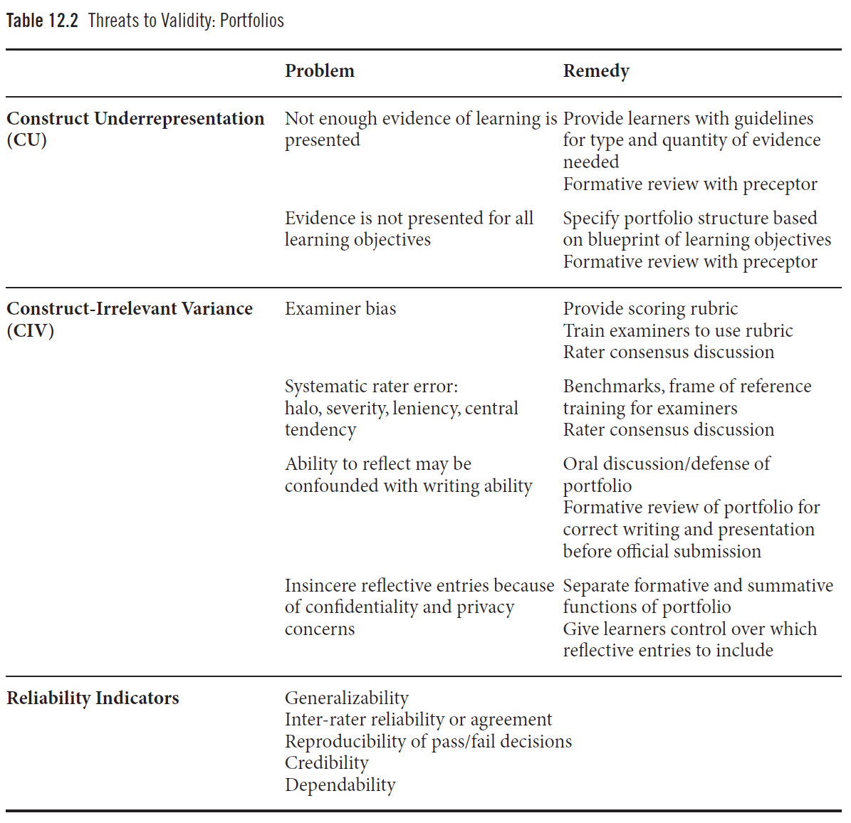 포트폴리오는 다른 평가방법들과 동일하게 타당도(validity) 위협에 노출된다 (Chapter 2 및 Table 12.2 참고). 이러한 이유로 포트폴리오는 단독으로 사용되기보다는, 학습자의 역량(competence)을 삼각측량(triangulate)할 수 있는 종합적 평가체계(comprehensive assessment system)의 일부로 활용되는 것이 가장 효과적이다 (Melville et al., 2004; Webb et al., 2002; Tochel et al., 2009).