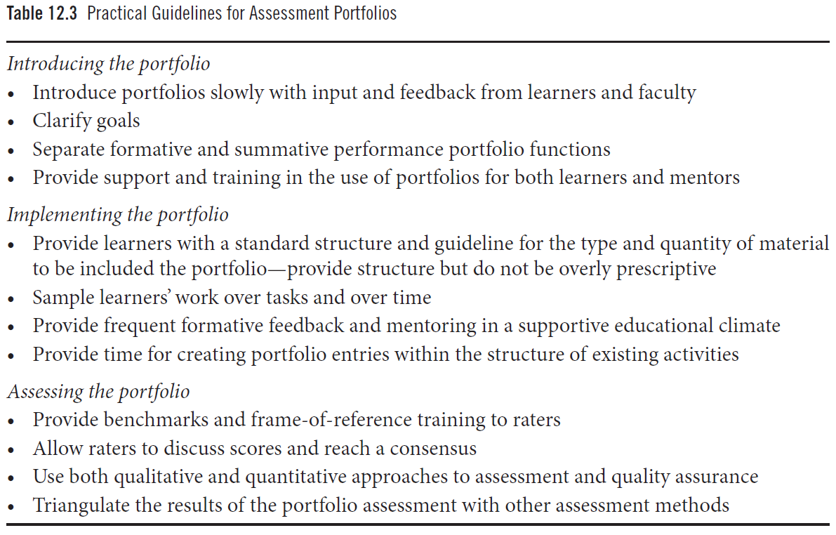 표 12.3(Table 12.3)은 보건전문직 교육(health professions)에서 평가 포트폴리오(assessment portfolios)를 성공적으로 구현하기 위한 가이드라인 요약(summary of guidelines)을 제시한다.