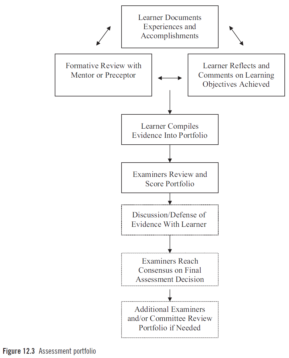 그림 12.3(Figure 12.3)은 포트폴리오 구술 방어(oral “defense” of the portfolio)가 학습자에게 포트폴리오의 내용을 정리(compiling)하고 제시(presenting)할 기회를 제공하는 동시에, 평가자(examiners)가