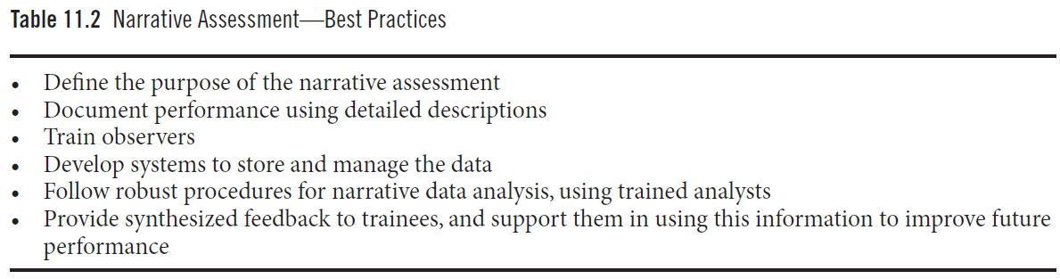 비록 서술형 평가는 일반적으로 숫자형 평가(numeric assessment) 보다 더 주관적(subjective) 이라고 여겨지지만, 실제로는 서술형 평가가 타당(valid)하고 방어 가능한(defensible) 결정을 지지할 수 있다는 증거가 존재한다. 연구에 따르면, 서술형 평가는 훈련생 수행에 대한 강력하고 풍부한 정보(robust information) 를 제공할 수 있다(Bartels, Mooney, & Stone, 2017; Driessen, van der Vleuten, Schuwirth, van Tartwijk, & Vermunt, 2005; Ginsburg, van der Vleuten, & Eva, 2017). 또한, 서술형 자료(narrative data)는