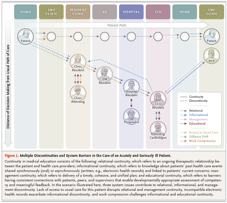 이 그림은 결국 환자 진료가 여러 단계로 나뉘면서 (1) 환자-의사 관계가 깨지고, (2) 의사-의사 간 정보 전달이 실패하며, (3) 학생-교수 간 교육이 단절되는 총체적인 불연속성(collective tolerance of discontinuity)의 문제를 한눈에 보여주고 있습니다.