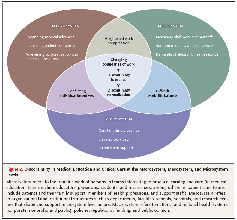 그림 2. 거시 시스템(Macrosystem), 중간 시스템(Mesosystem), 미시 시스템(Microsystem) 수준에서의 의학 교육 및 임상 진료의 불연속성.