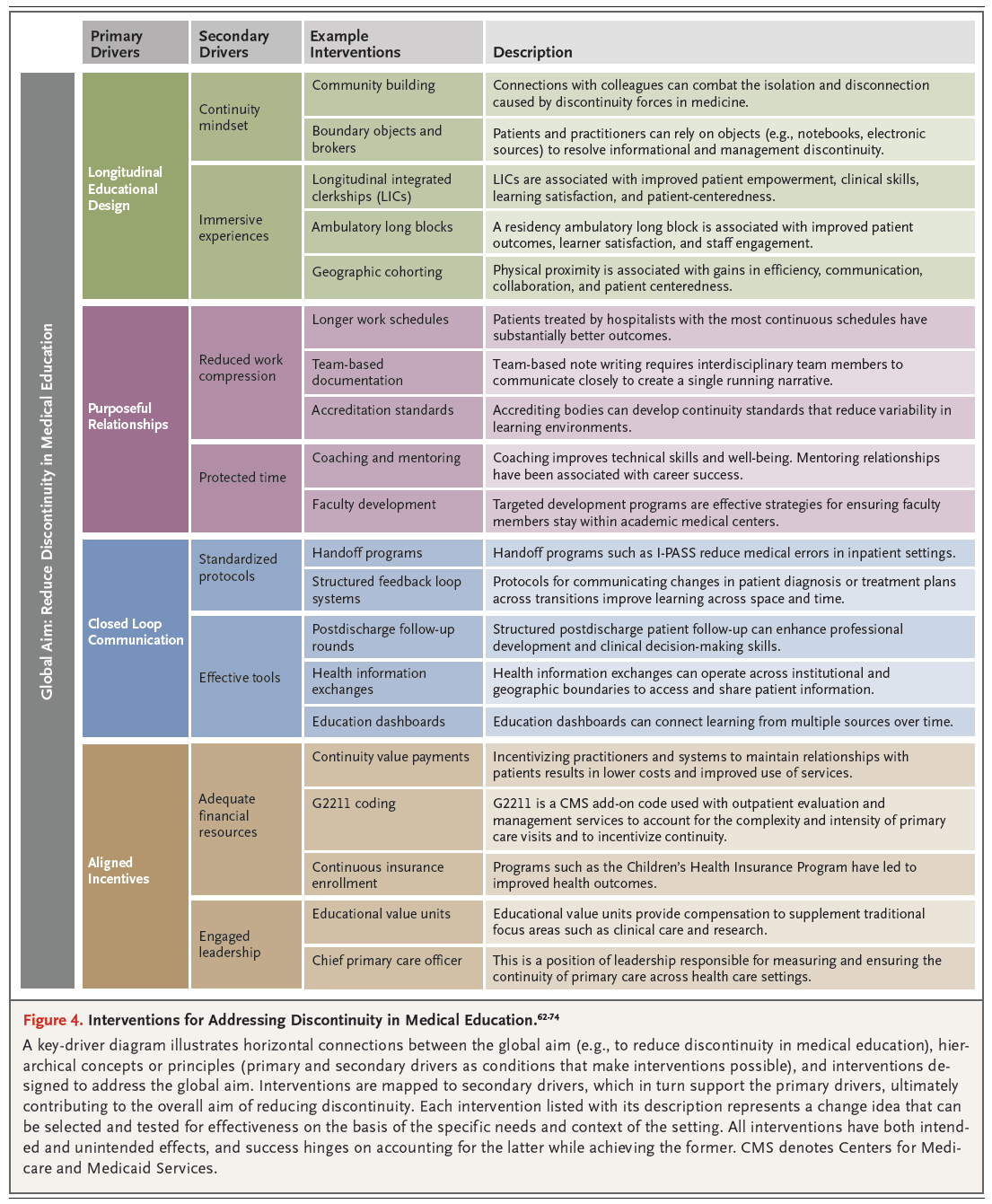 우리는 모든 시스템 수준(every system level)에서 진료의 연속성(continuity of care)을 창출할 방법을 찾아야 하며 그것이 왜 그렇게 어려운지 이해해야 합니다. 우리는—의료 수련생, 전문가, 조직, 그리고 환자들—모든 시스템 수준의 참여자들의 삶과 교육 경험을, 다른 이들을 희생시키지 않으면서(without sacrificing any for the others) 어떻게 향상시킬 수 있는지 탐구해야 합니다. 그림 4는 특정 환경 전반에서 가능성을 보여준(shown promise) 선택된 중재(selected interventions)들의 핵심 동인 다이어그램(key-driver diagram)을 보여줍니다. 핵심 동인(Key drivers)은 중재(interventions)가 아니라, 중재를 가능하게 하는 조건(conditions that make interventions possible)입니다. 모든 중재는 의도된 효과(intended effects)와 의도되지 않은 효과(unintended effects)를 모두 가지며, 성공은 전자를 달성하면서 후자를 설명(accounting for)하는 데 달려있습니다. 교육 혁신가들(Educational innovators)은 자신의 학습 환경에서 가장 의미 있는(make the most sense) 중재를 고려하고 테스트(test)해야 할 것이며, 성공은 아마도 보건 시스템(health system) 내의 다중 중재(multiple interventions)에 달려있을 것입니다.