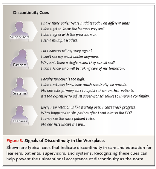 여기에는 학습자, 환자, 지도 교수(supervisors), 그리고 시스템의 진료 및 교육에서의 불연속성을 나타내는(indicate) 일반적인 신호(typical cues)들이 나와 있습니다. 이러한 신호들을 인식하는 것은 불연속성이 표준(norm)으로 의도치 않게 받아들여지는(unintentional acceptance) 것을 방지하는 데 도움이 될 수 있습니다.