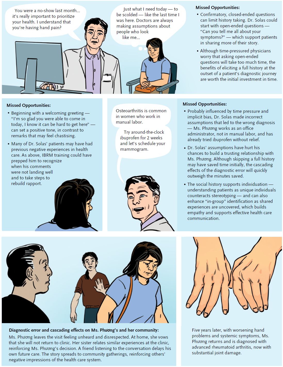 - 아마도 시간 압박(time pressure)과 암묵적 편향(implicit bias)에 영향을 받아, 솔라스 의사는 부정확한 가정(incorrect assumptions)을 함 (프엉 씨는 육체노동이 아닌 사무 관리자(office administrator)로 일하며, 이미 이부프로펜을 복용했지만 효과가 없었음).