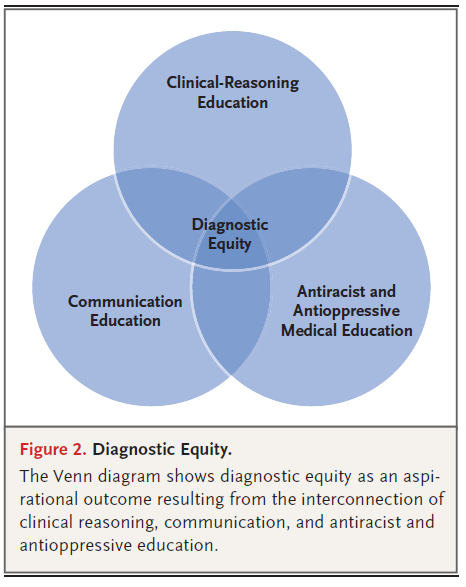 이 벤 다이어그램(Venn diagram)은 진단 형평성(diagnostic equity)을 임상 추론(clinical reasoning), 커뮤니케이션(communication), 그리고 반인종차별 및 반억압(antiracist and antioppressive) 교육의 상호연결(interconnection)에서 비롯되는 염원하는(aspirational) 결과(outcome)로 보여줍니다.