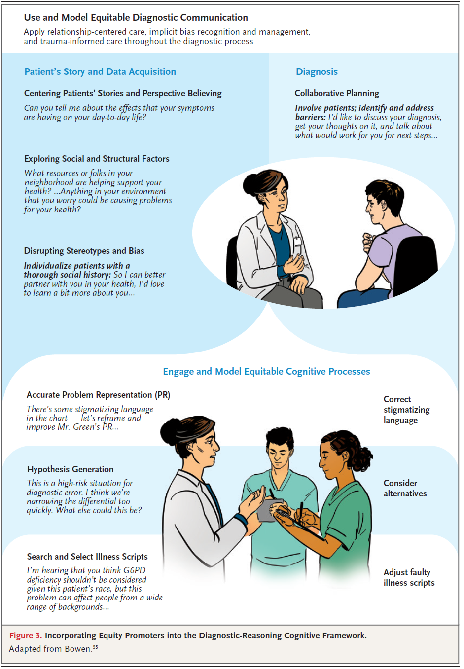 "Such a model should include teaching about diagnostic inequities; discussing diagnosis as a contextual, collaborative process; infusing clinicians’ cognitive processes with equity considerations; creating opportunities to learn and practice equitable diagnostic communication; and modeling strategies to empower the full diagnostic team."