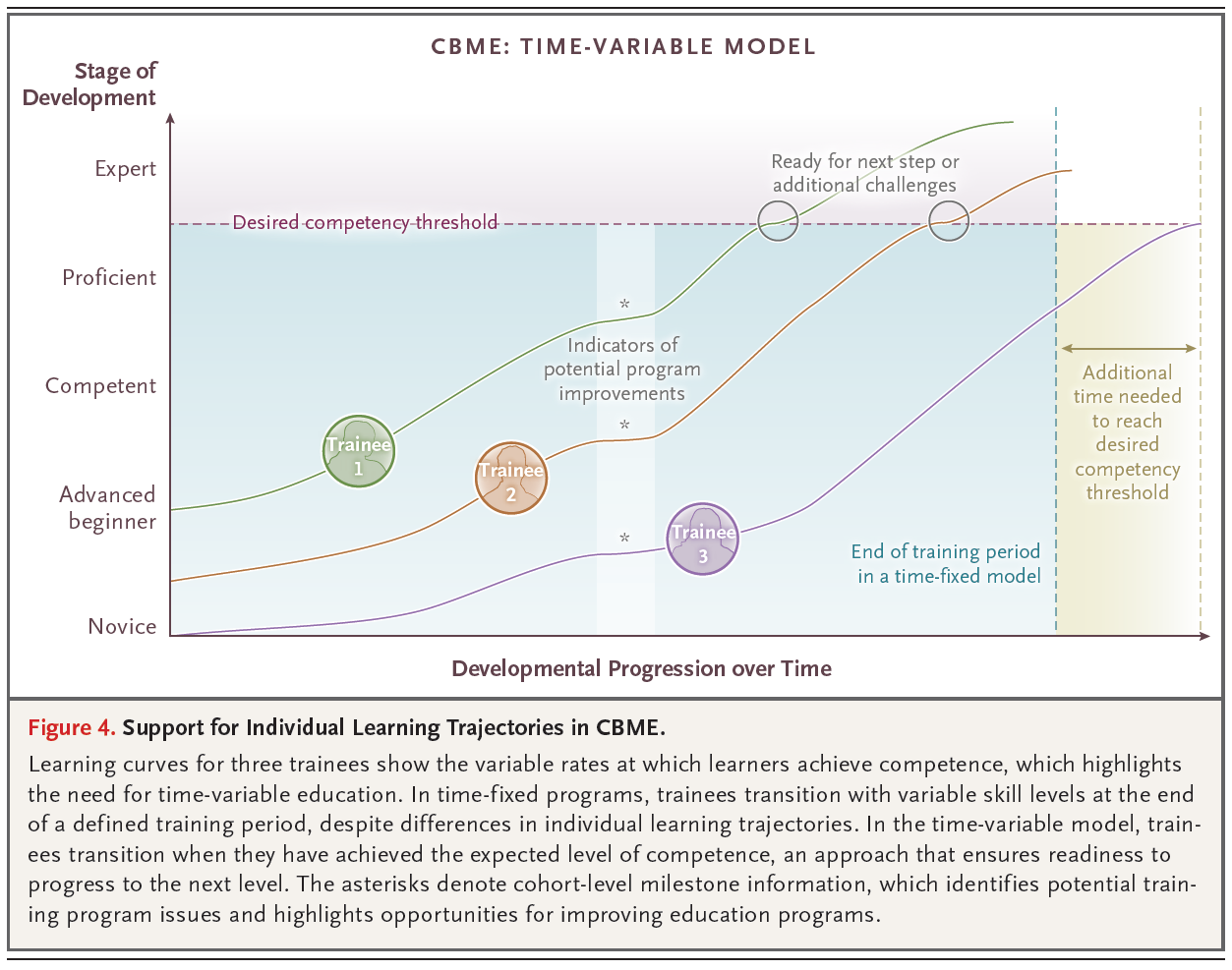 CBME 모델에서는 학습자(trainee)가 필요한 역량을 달성했다는 것이 확인되어야만 다음 단계로 나아갈 수 있습니다. 누구는 더 빠를 수도, 누구는 더 많은 시간이 필요할 수도 있죠. 시간을 역량을 쌓기 위한 '자원(resource)'으로 활용하는 것입니다.
