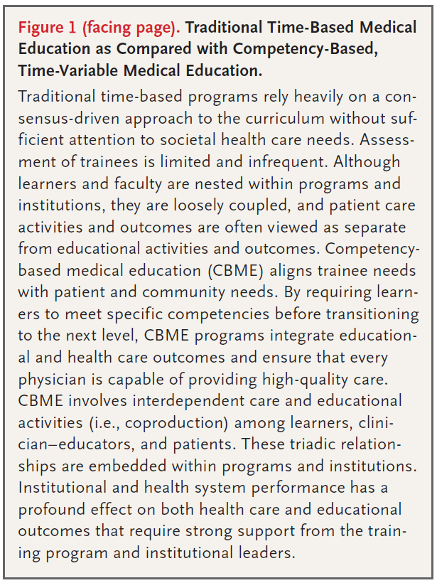 CBME 운동의 초기 동력(initial impetus)은 전통적인 의학 교육 훈련 프로그램을 이수한 졸업생들의 편차가 있는 능력(varying abilities)에 대한 구체적인 우려를 해결하고자 하는 열망이었습니다.3–6,8,12 전통적인 의학 교육의 특징인 고정된, 시간 기반(fixed, time-based) 훈련—미국의 경우 의학 학부 교육 4년, 일반 전문의를 위한 의학 졸업 후 교육 3년—은 모든 피수련자가 이 미리 정해진(predefined) 훈련 기간이 끝날 때 다음 단계로 이행(transition)할 준비가 되어 있다고 가정합니다.10,12,13 이러한 가정에 맞서, CBME 모델은 측정 가능한 구체적인 교육 성과(specific assessable educational outcomes)를 정의하고 목표로 삼으며, 피수련자들이 서로 다른 발달 궤적(developmental trajectories)을 가질 수 있음을 인정합니다 (NEJM.org에서 기사 전문과 함께 제공되는 보충 부록의 그림 1 및 표 S1 참조).12-17 이를 통해 CBME는 피수련자의 준비 상태(trainee preparedness)에 대한 더 큰 책무성(accountability), 피수련자가 요구되는 성과를 달성하도록 지원하는 시간 기반 유연성(time-based flexibility), 그리고 역량 기준(standards of competency)을 타협하지 않으면서 경로를 설계하는 피수련자 중심성(trainee centeredness)을 약속합니다.12,18 환자와 가족을 돌볼 준비가 다양한 수준으로(variably prepared) 갖춰진 졸업생을 배출하는 대신,5 CBME는 훈련을 사회적 요구(societal needs)에 맞추고13,15 모든 졸업생이 인구 집단 건강 향상, 건강 형평성 증진, 환자 의료 서비스 개선, 의료 전문가 지원 강화, 의료 비용 절감이라는 5중 목표를 달성하는 데 필요한 지식, 기술, 전문직업적 태도(즉, 능력(abilities))를 갖추도록 보장하는 것을 목표로 합니다.2,16