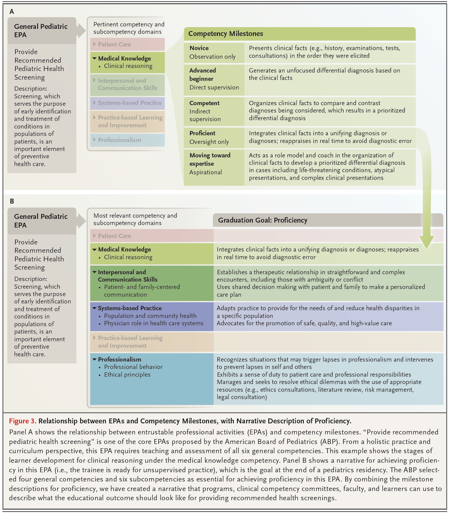 - 패널 B는 이 EPA에서 숙련도(proficiency)를 달성하기 위한 서술적 기술(narrative)을 보여줍니다(즉, 피수련자가 지도 감독 없이[unsupervised] 이 활동을 수행할 준비가 되었음을 의미함). 이는 소아과 레지던시의 종료 시점(end)의 목표입니다. ABP가 선정한 4가지 일반 역량과 6가지 하위 역량을 숙련도 달성을 위해 결합하여, 우리는 프로그램 임상 역량 위원회(program clinical competency committees), 교수진, 그리고 학습자가 '권장되는 소아 건강 스크리닝 제공'에 대한 교육적 성과(educational outcome)가 어떠해야 하는지 설명하는 데 도움을 줄 수 있는 서술적 내러티브(narrative)를 만들었습니다.
