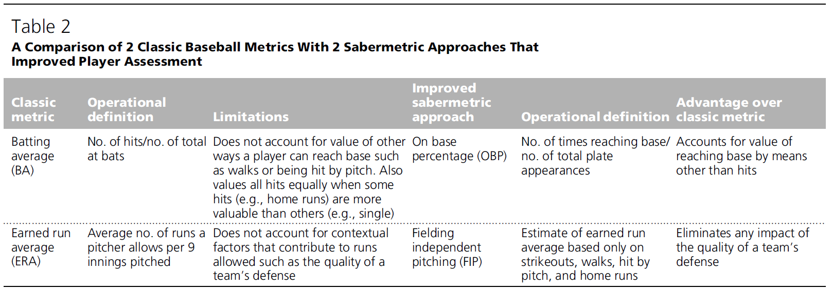표 2 - 선수 평가를 개선한 2가지 고전 야구 지표와 2가지 세이버메트릭스 접근법의 비교 (A Comparison of 2 Classic Baseball Metrics With 2 Sabermetric Approaches That Improved Player Assessment)